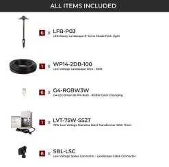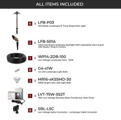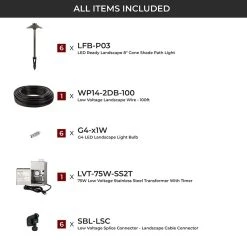 LED Landscape Lighting Kit – 6 Cone Shade Path Lights – 2 Spotlights – Stainless Steel Transformer
