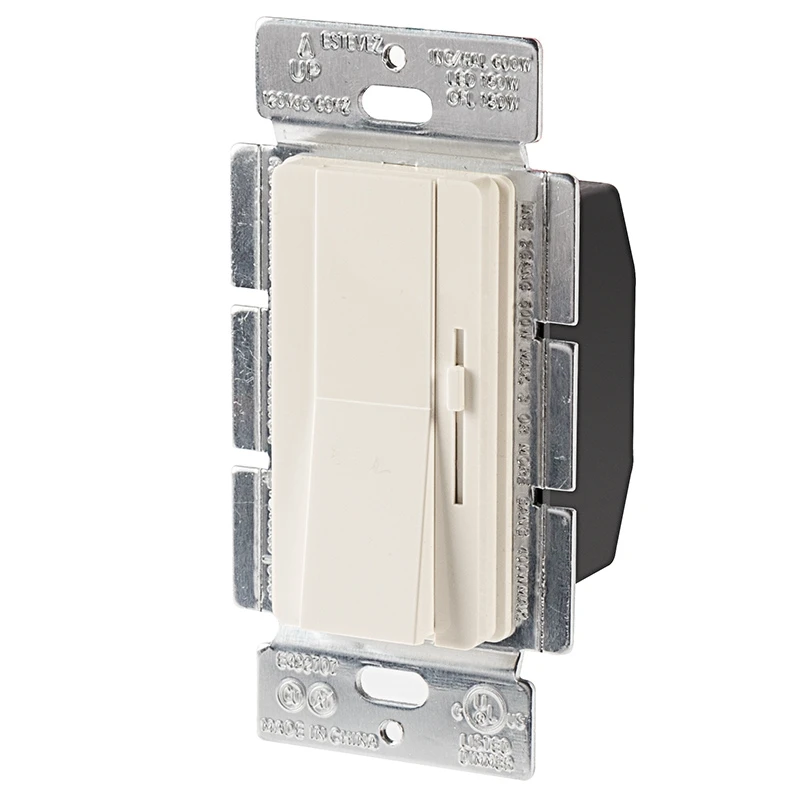Use this 0-10V LED switch and slide dimmer on LED fixtures, such as panels and high-bay lights, with 0-10V dimming capabilities. It has a paddle for on/off functionality and a small slider for dimming. Use the 3-way switch to control lights from two locations. Integrated high- and low-end trim adjustment dials allow access to the lowest and highest light levels without flickering. The dimmer is rated for six amps at 120 VAC or three amps at 277 VAC (amps = fixture wattage/voltage).