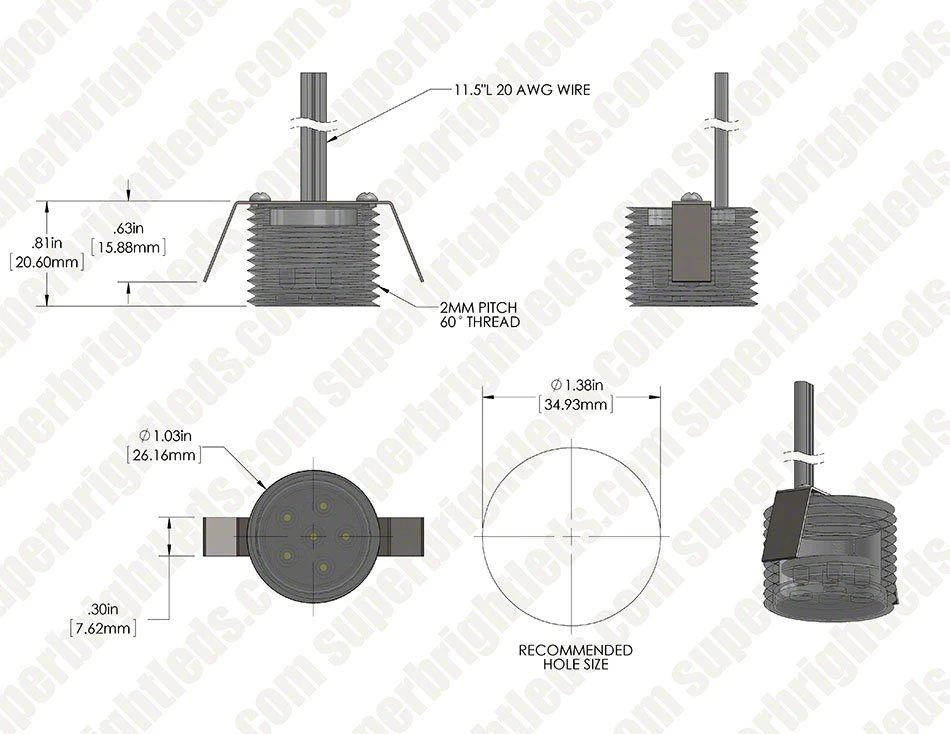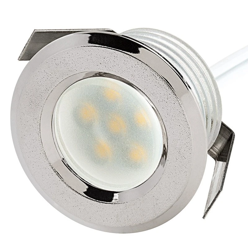 Mini round recessed LED lights are a great way to add safety lighting to steps, stairways, and hallways. This LED step light is also perfect for under-cabinet lighting, indoor accent lighting, closet lighting, bar lighting, and shelf lighting. The six LEDs have an output of 25 lumens and create a 90-degree beam for accent and functional ambient lighting. This low-voltage step light has a 12V AC/DC operation. A weatherproof polycarbonate housing and frosted polycarbonate lens seal all internal components while delivering soft, even light. Flush mount in a 1.38″ hole using mounted retaining clips. Select a face plate to match your designs.