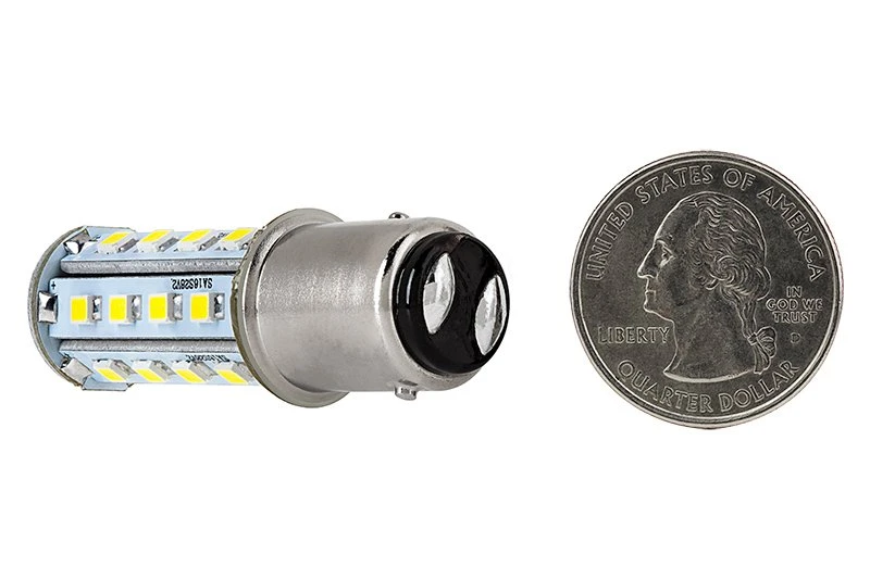 LED replacement bulbs can fit vehicle tail lights, brake lights, reverse lights, turn signals or side marker lights. This 1157 dual-contact, dual-function bulb has 28 LEDs (0.5-watt SMD) that create a 360° viewing angle for better, allover light emission with reduced hot spots. Tower-style design with a BAY15D 15-mm bayonet base for easy plug-and-play installation—just twist to lock in place. The energy-efficient bulb operates with in a wide 9-14.8V DC range and is designed to last 30,000 hours on your car, truck, SUV, or van—25 times longer than incandescent bulbs. Available in cool white, natural white, amber and red. Not sold in pairs. Price per bulb.