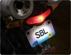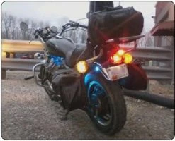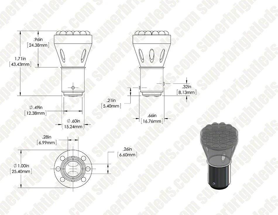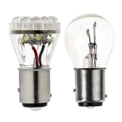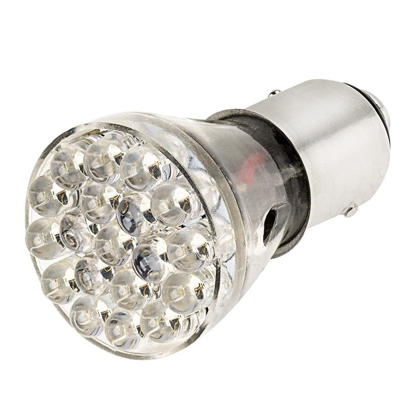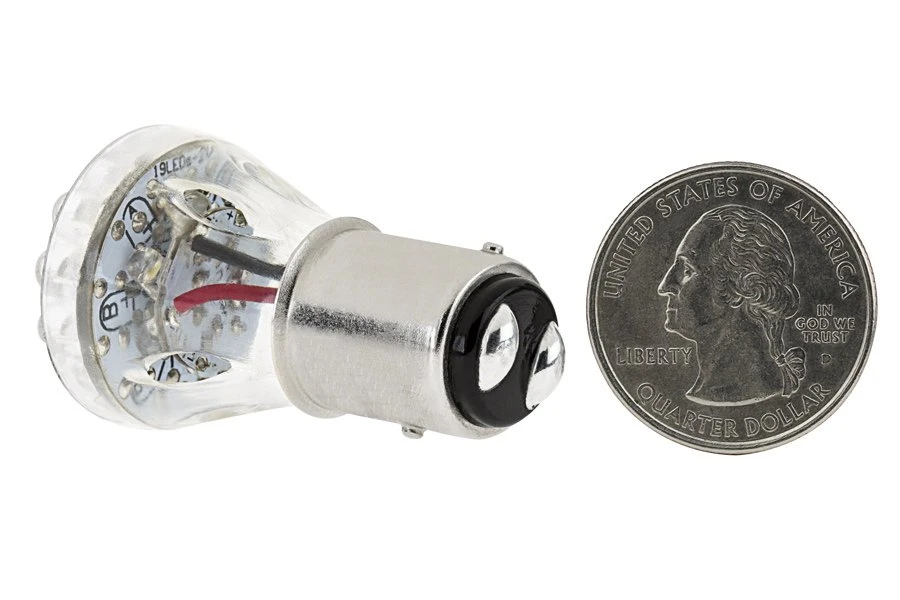 LED replacement bulbs can fit motorcycle tail lights and brake lights while doubling as a license plate light. This 1157 dual-contact, dual-function bulb has 25 LEDs (3-mm and 5-mm). 19 Red LEDs aim forward from tail lights and brighten when brakes are engaged, and 6 radially mounted cool white LEDs illuminate your license plate. BAY15D 15-mm bayonet base for easy plug-and-play installation—just twist to lock in place. The energy-efficient bulb operates with in a wide 9-14.8V DC range and is designed to last 50,000 hours on your motorcycle—42 times longer than incandescent bulbs. Not sold in pairs. Price per bulb.