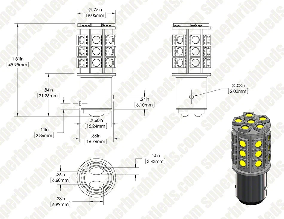 LED replacement bulbs can fit vehicle tail lights, brake lights, reverse lights, turn signals or side marker lights. This 1157 dual-contact, dual-function bulb emits a 360° viewing angle for better, allover light emission with reduced hot spots. The bulb features a tower-style design with a BAY15D 15-mm bayonet base for easy plug-and-play installation—just twist to lock in place. This energy-efficient bulb operates with in a wide 10-30V DC range and is designed to last 25 times longer than incandescent bulbs on your car, truck, SUV, or van. Available in cool white, natural white, amber, and red.