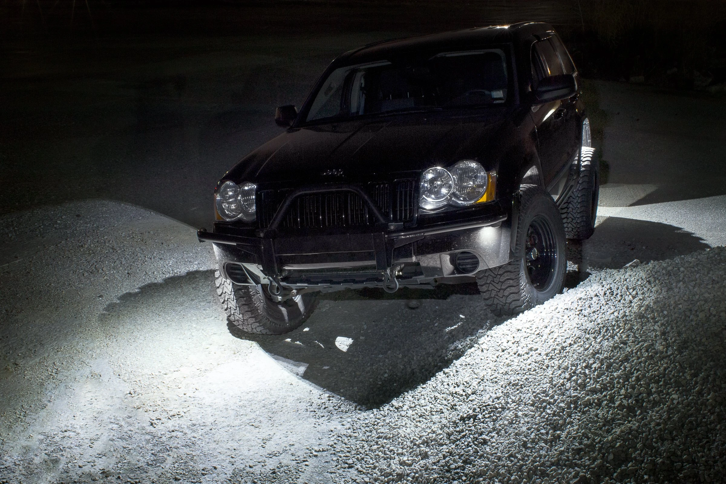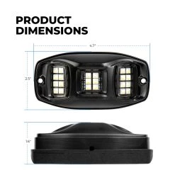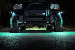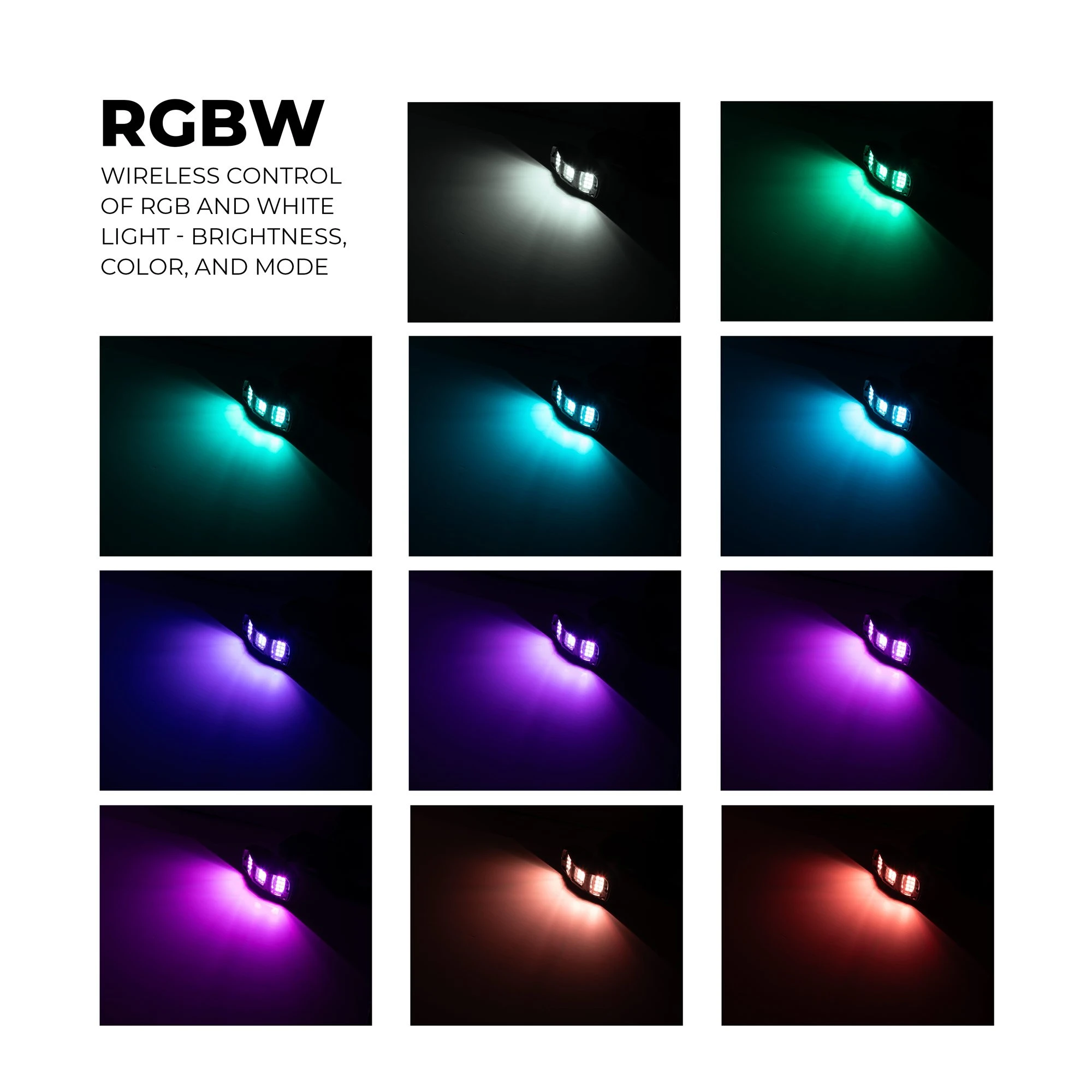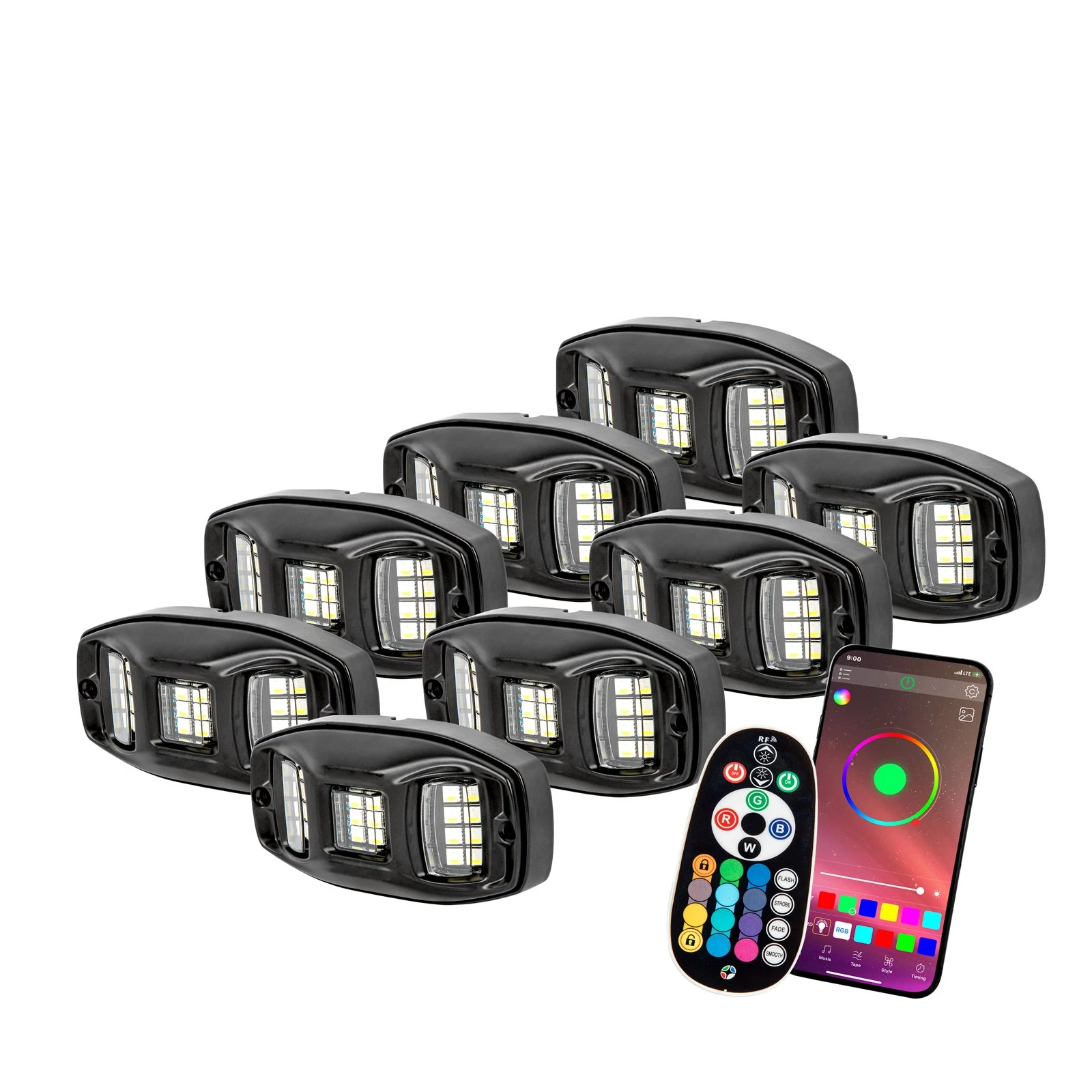 Our off-road RGBW LED rock light kit with remote stands up to dirt, water, and rough terrain while providing vibrant RGB colors and cool white illumination. It has Bluetooth app control for convenient brightness, color, and mode adjustment with multiple dynamic modes, including music sync. This underglow kit has 4, 8, or 12 waterproof lights with mounting pads, hardware, a Bluetooth controller, and an RF remote control. The rugged diecast aluminum housing and polycarbonate lens are sealed with epoxy to protect internal components.