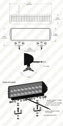 This Xtra series light produces 3,780 raw lumens of cool white light from 18 LEDs. The dual-row design emits a 35° beam pattern. The 12” long aluminum housing and polycarbonate lens protect internal components. An integral heat sink allows the LEDs to run cool, extending life span. Includes 2 adjustable stainless steel mounting brackets and installation hardware.