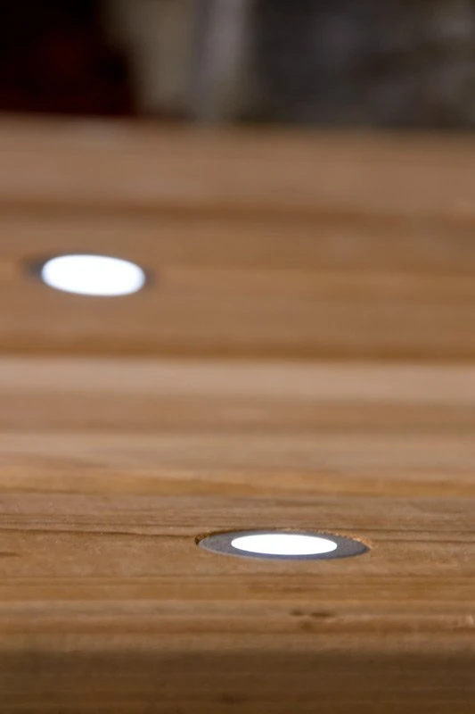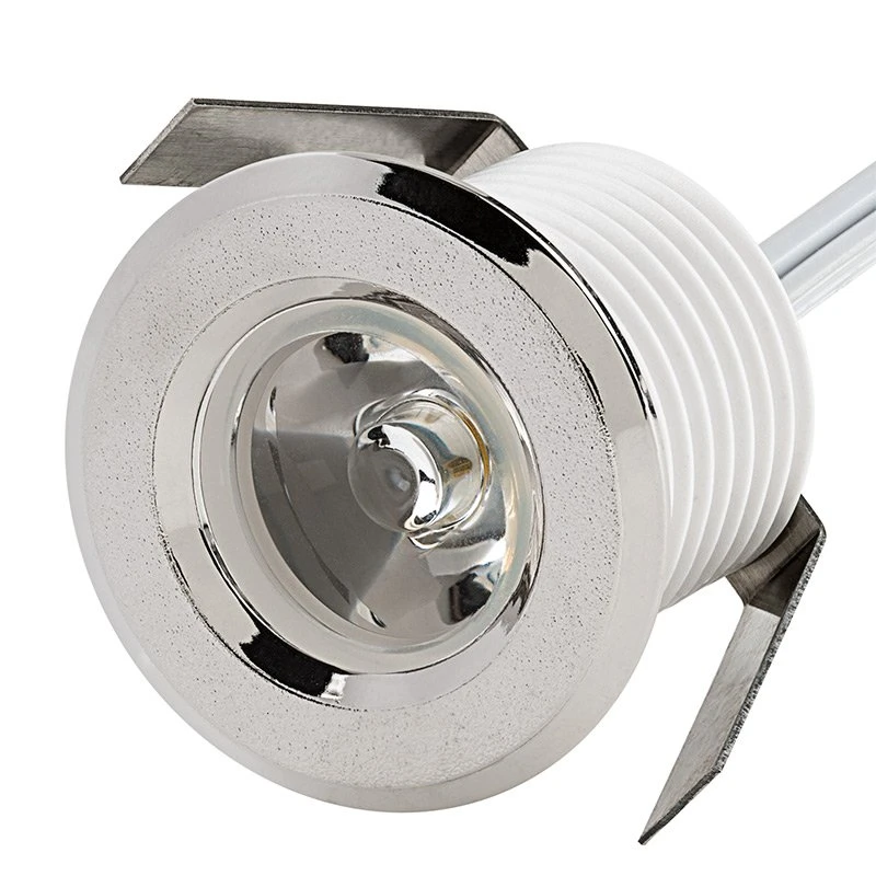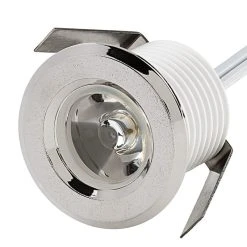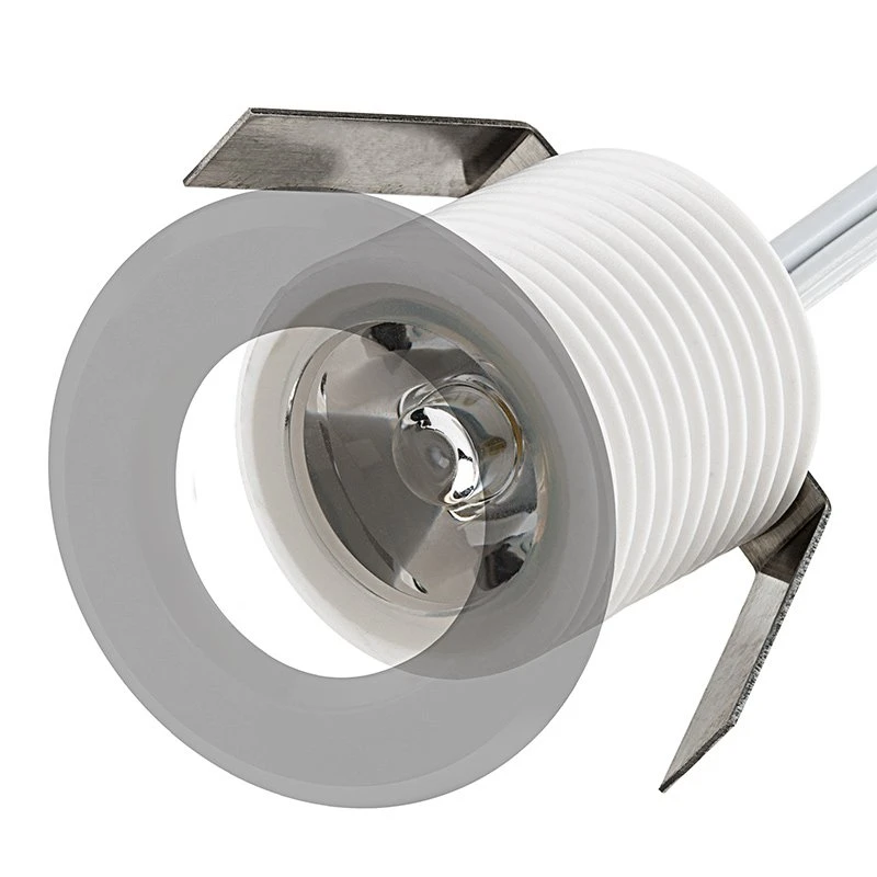 Mini round recessed LED lights are a great way to add accent or safety lighting to steps, stairways, and hallways. This LED step light is also perfect for under-cabinet lighting, indoor accent lighting, closet lighting, bar lighting, and shelf lighting. The LED has an output of 55 lumens and creates a 45-degree beam angle for accent and functional ambient lighting. This low-voltage step light has a 12V AC/DC operation. A weatherproof polycarbonate housing and shatterproof plastic lens seal all internal components. Flush mount in a 1.38″ hole using mounted retaining clips. Select a face plate to match your designs.