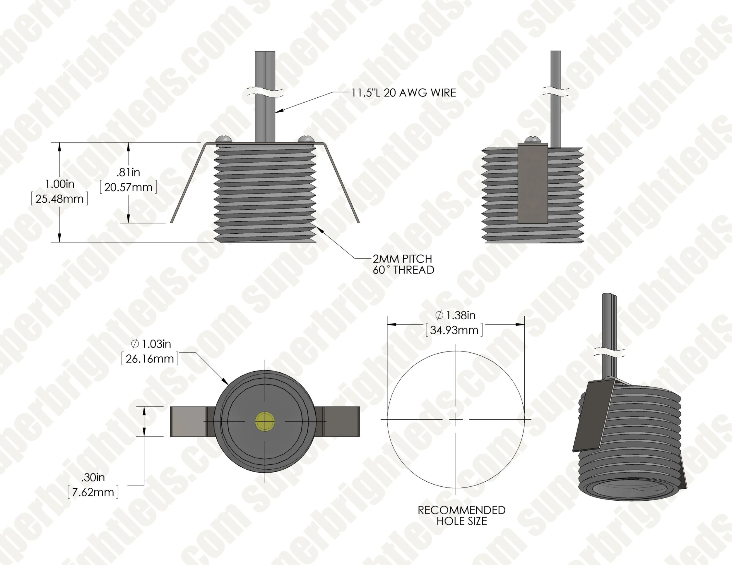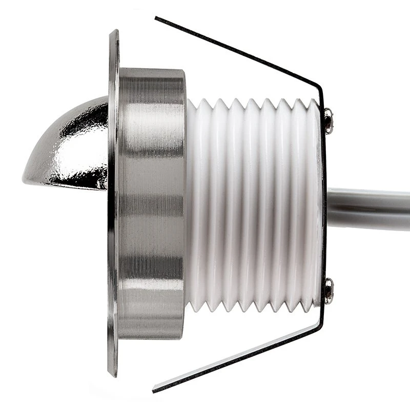 Mini round recessed LED lights are ideal for deck or step lighting, and you can use them in other outdoor lighting applications, such as pathway lighting. The single LED has an output of 60 lumens with a 45-degree beam angle for accent lighting and ambient lighting. This low-voltage step light has a 12V AC/DC operation for wiring directly into your existing landscape lighting system. A waterproof polycarbonate housing and shatterproof acrylic lens seal all internal components. Flush mounts in a 1.38″ hole using mounted retention clips. Available with a black, white, or brushed nickel metal trim and hood to match your designs. See similar 6-LED Round Metal Trim Mini Step Lights.