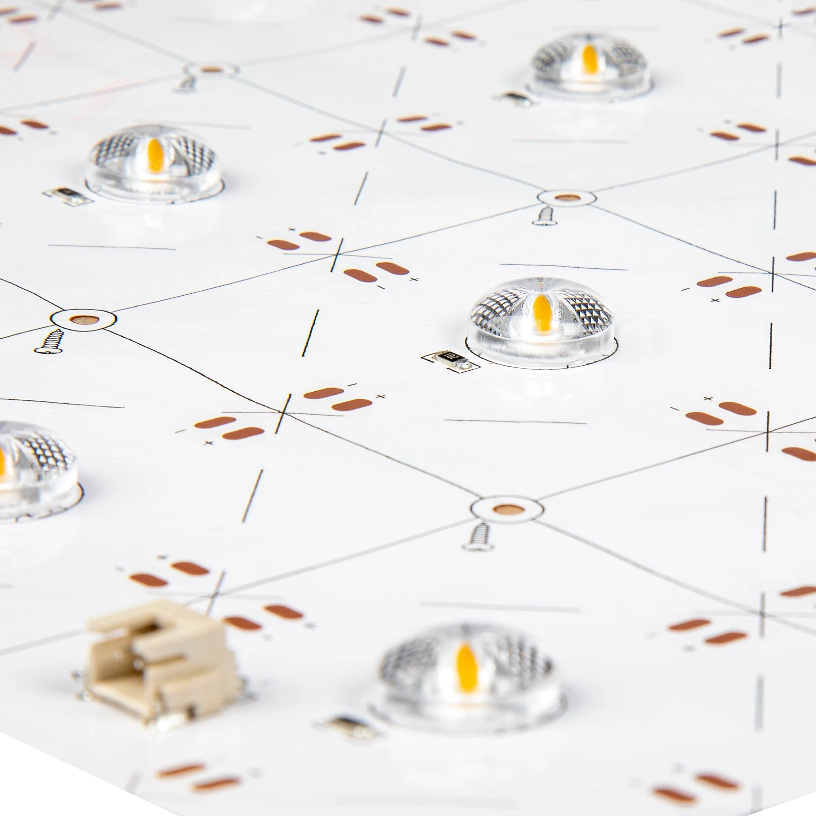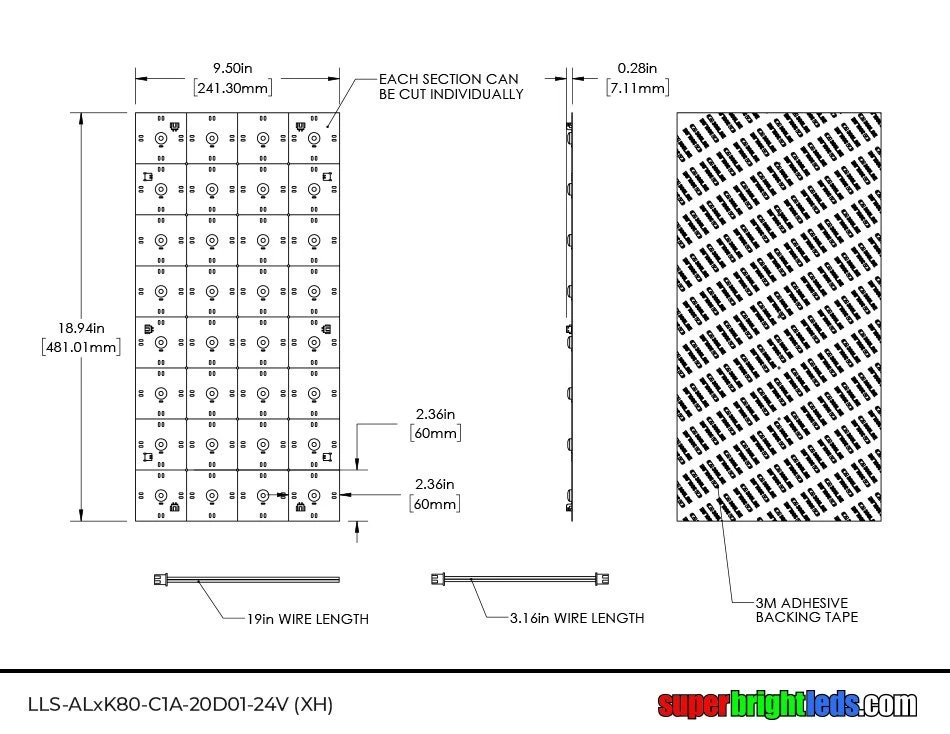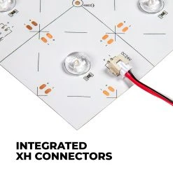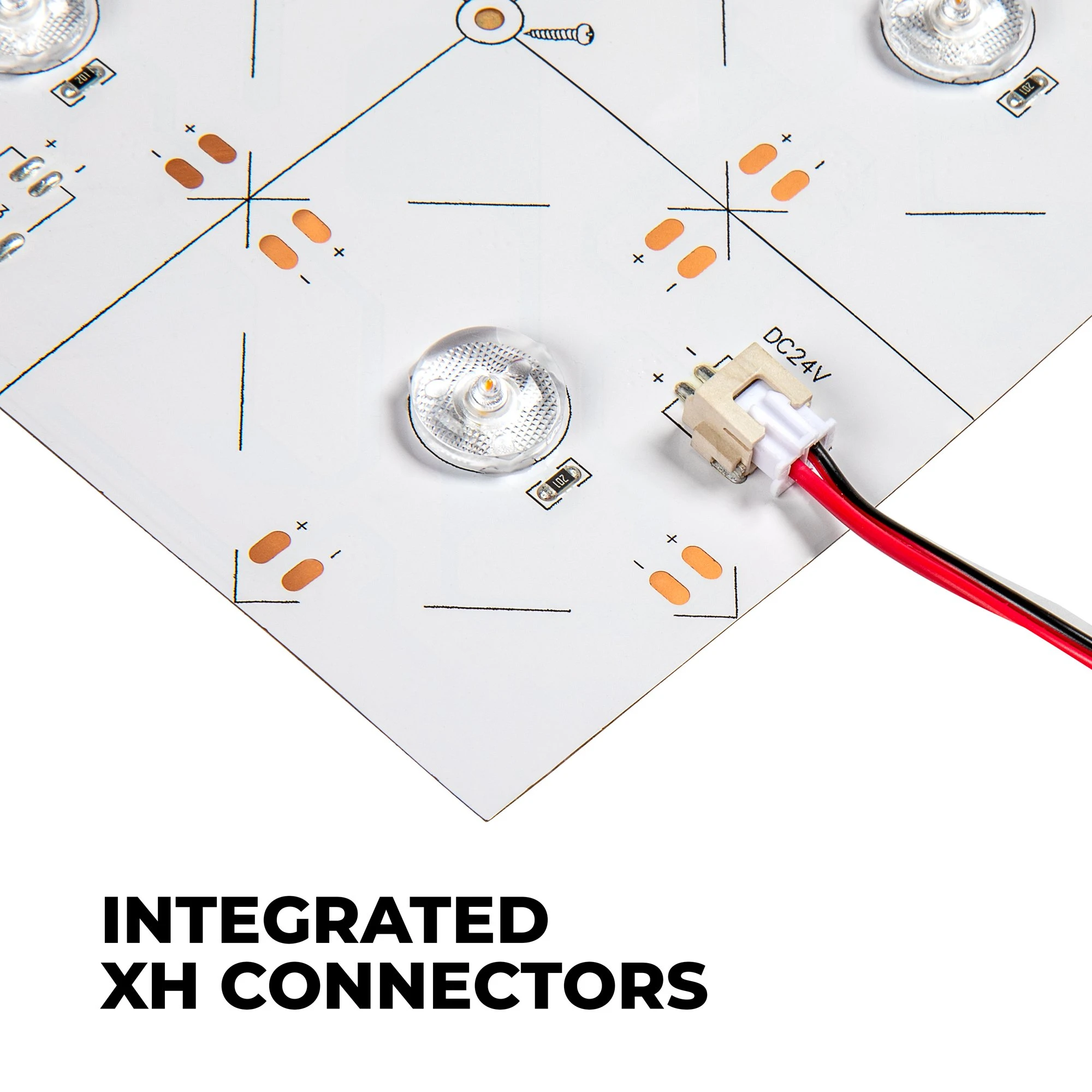 Trim to fit a unique shape and wrap corners with this 24V LED Light Sheet. This flexible sheet can be segmented in any unique shape simply by cutting along the horizontal, vertical, or diagonal black lines. LEDs’ distribution ensures even light distribution, even in signs or backlighting with low clearance. On-board XH connectors eliminate soldering and simplify installation. To connect multiple light sheets, use the included interconnect cable. To install, use the 3Mβ’ adhesive backing, or fasten it with screws at the indicated spots.