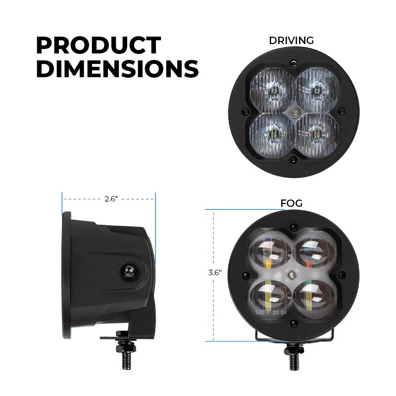 SL3 SAE Series features road-legal LED POD Lights for fog and driving applications. The 3β LED pod lights feature durability and versatility for a range of off-road lighting applications. Built to withstand rugged outdoor conditions, the pod lights are IP67 waterproof rated with an aluminum housing and a polycarbonate lens. Advanced TIR optics maximize the LEDβs illumination, creating a smooth and uniform light beam. The DOT-compliant 8ΒΊ x 24ΒΊ driving beam pattern is ideal for long-range lighting with wide area coverage. The DOT-compliant 6ΒΊ x 36ΒΊ fog beam pattern works for close-range front and side area coverage.