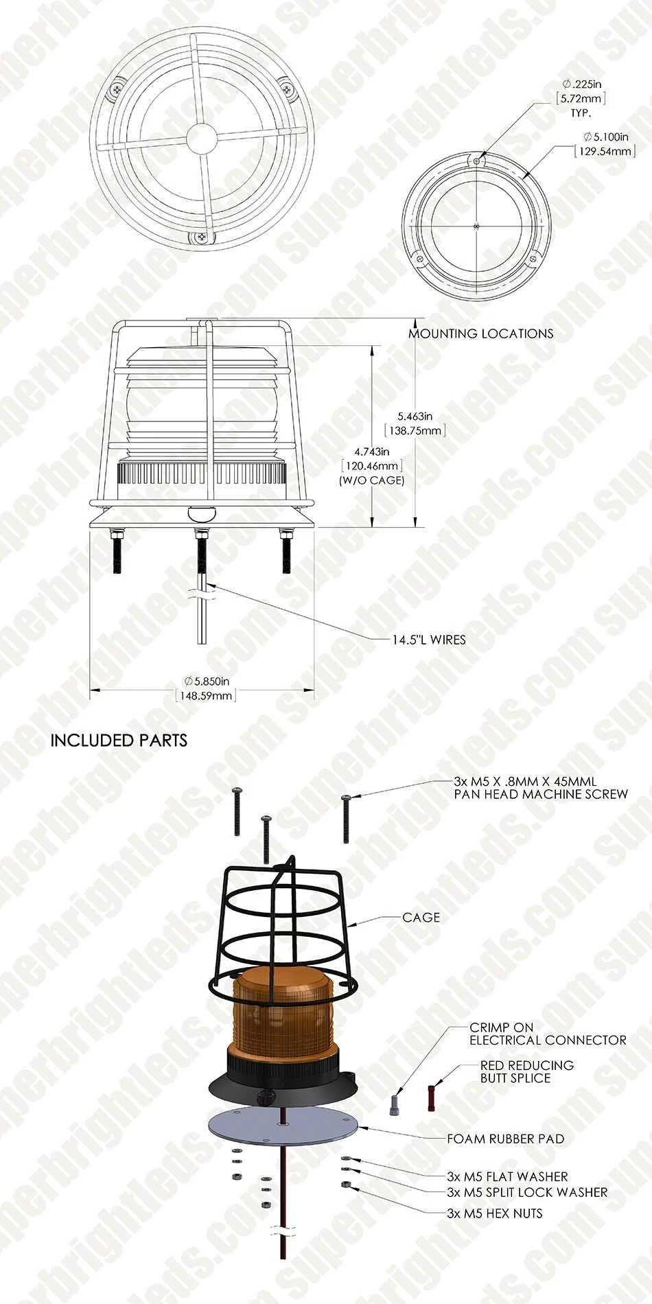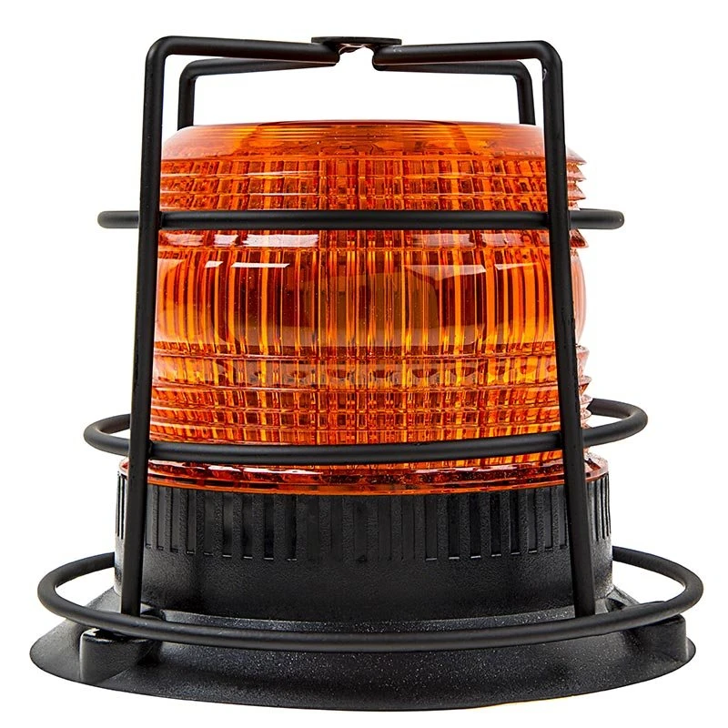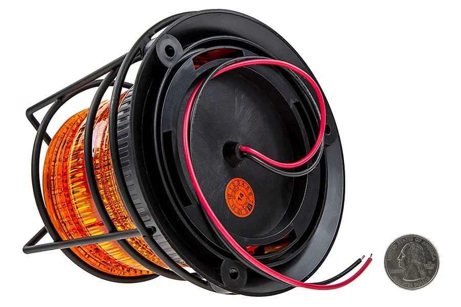 Lifetime warranty on all emergency vehicle and strobe LED lights. 4-3/4″ Amber LED Strobe Light Beacon with protective wire cage for warning/hazard lighting. Three modes: 360 degree rotating pattern, six flashes pattern and dual flashes pattern. 12~24VDC wide input voltage range. Suitable for use on warehouse equipment such as forklifts, order pickers, and other industrial vehicles. 14.5″ power wires – Materials: Polycarbonate lens, ABS mounting base. Dimensions: 5.85″ x 5.85″ x 4.75″ with o cage, 5.85″ x 5.85″ x 5.463″ with cage.