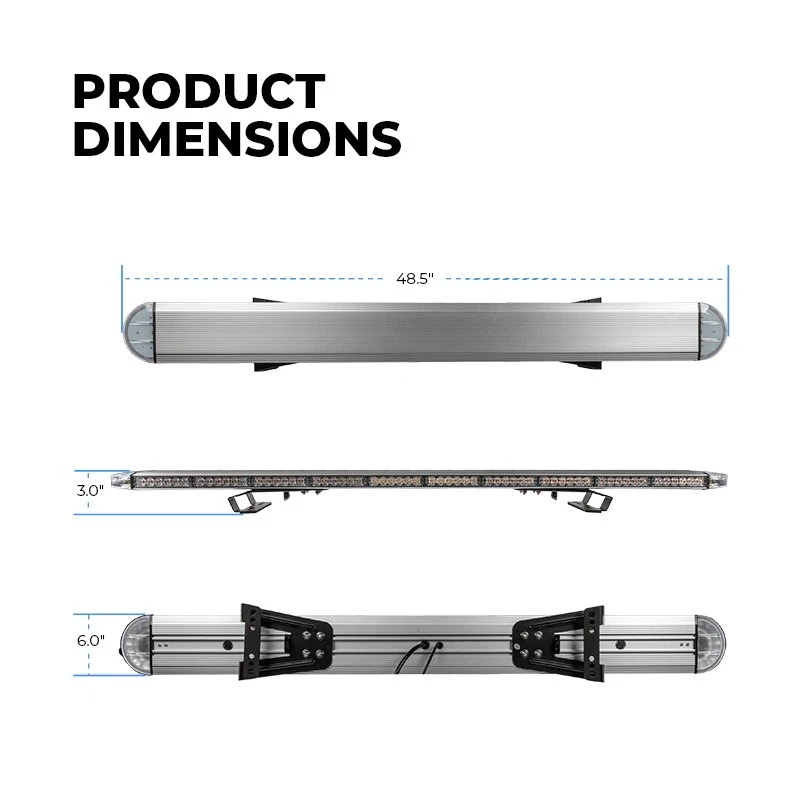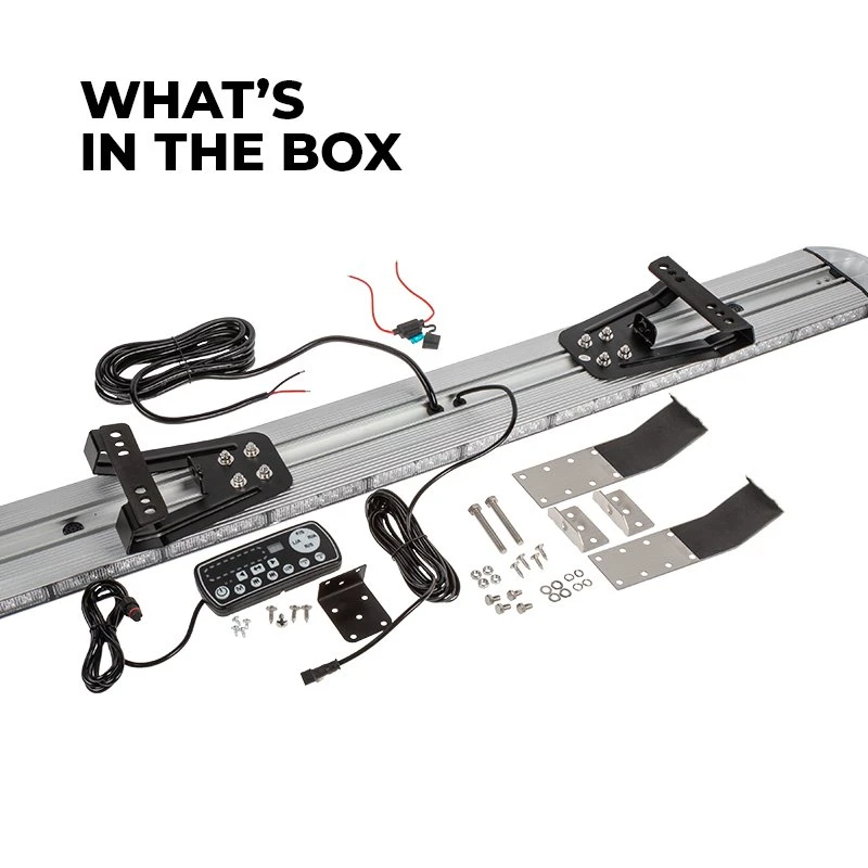 The 48β LED Light Bar with single or dual-color operation is available with 29 flash patterns for strobe, warning, and hazard lighting applications. The emergency light bar comes with front and rear spot lights and alley lights that provide additional sideway lighting. The pre-installed flash patterns have various strobe light options and one βsteadyβ option. A memory function retains the pattern used before the light bar was powered down. The included controller box allows for full control over the light bar from inside the truck cab, displaying the current pattern on the screen. Mount using the included no-drill roof mounting bracket. Hardwire to power using the pigtail wire.