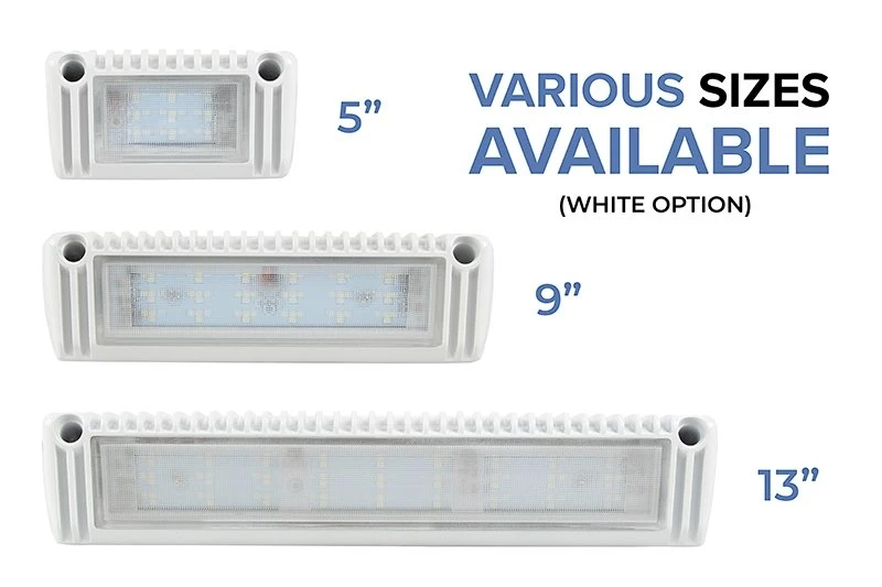 RV / Trailer LED Lights provide a versatile lighting solution for various outdoor and vehicle applications. Sealed waterproof aluminum housing and a shatter-resistant polycarbonate lens allow for consistent performance in harsh outdoor conditions. More energy-efficient and lower maintenance than standard incandescents with no bulbs to replace. Emits a wide 90Β° beam angle with 630 lumens of natural or cool white light. The low-profile design is perfect for RVs, trailers, porches, utility vehicles, and more.