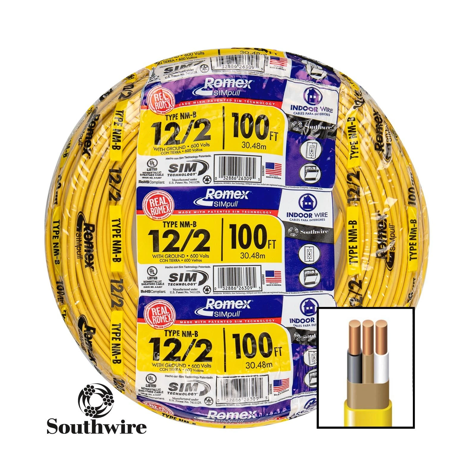 Southwire 12/2 Romex® SIMpull® NM-B (nonmetallic-sheathed) cable has three 12 AWG solid copper wires (two conductors, one ground). Electricians typically use Romex® wire as branch circuits for outlets and switches in residential wiring. Use this UL Listed Romex® cable for exposed and concealed work in dry locations at temperatures not exceeding 194°F (90°C). You can run this cable in air voids of masonry block or tile walls as long as the locations are not damp or wet. Wires are color-coded, and the SlikQuik® jacket allows for a 50% reduction in pulling force for easier installation.