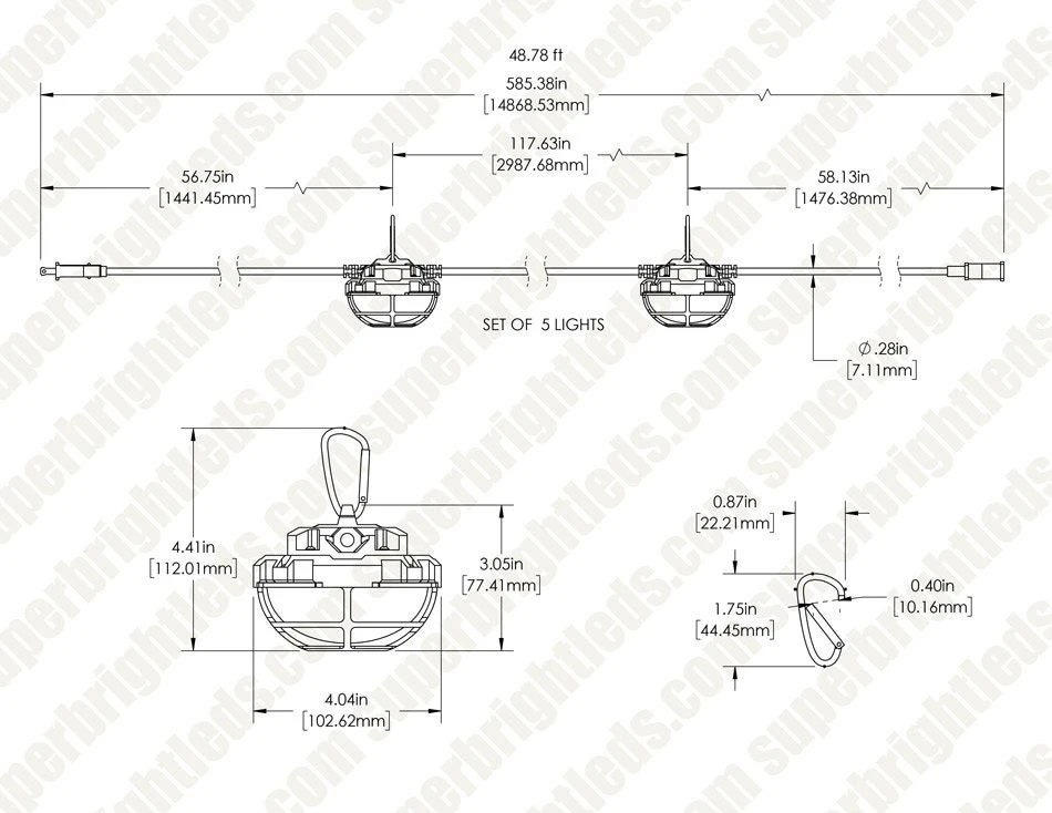 The 55W LED Temporary String Work Light provides 7,500 lumens for job sites, construction sites, and garages. The 50ft 5 bulb string has LED lamps spaced 10ft apart for a wide distribution of light. The polycarbonate housing and lens protect the LEDs from dust and water. Hang the LED fixtures using the included carabiners, and link up to 6 separate 50ft strings. Suitable for both indoor and outdoor usage.