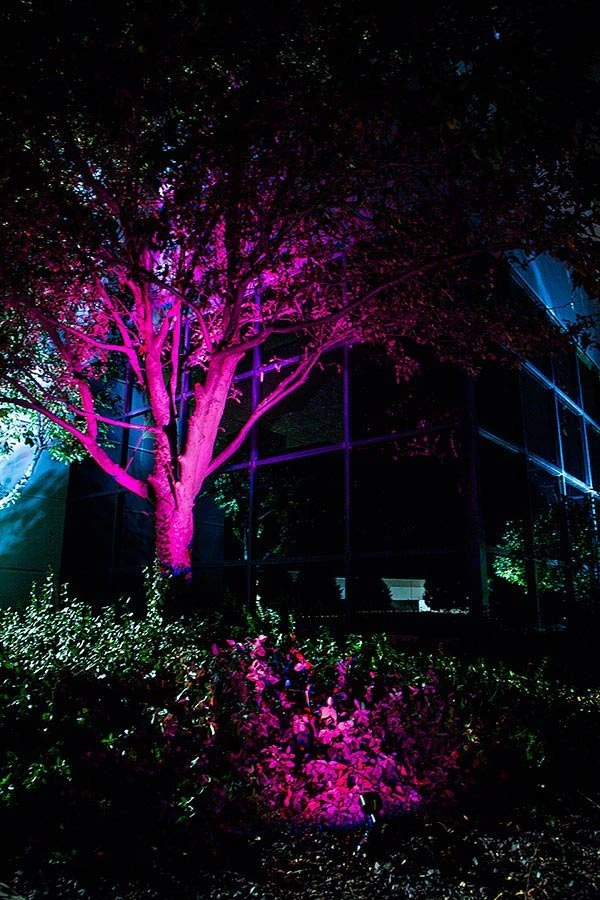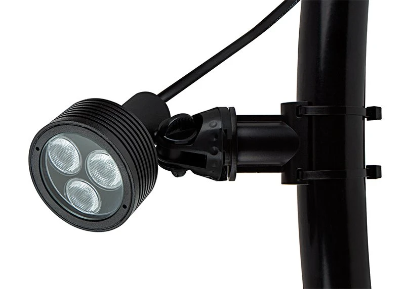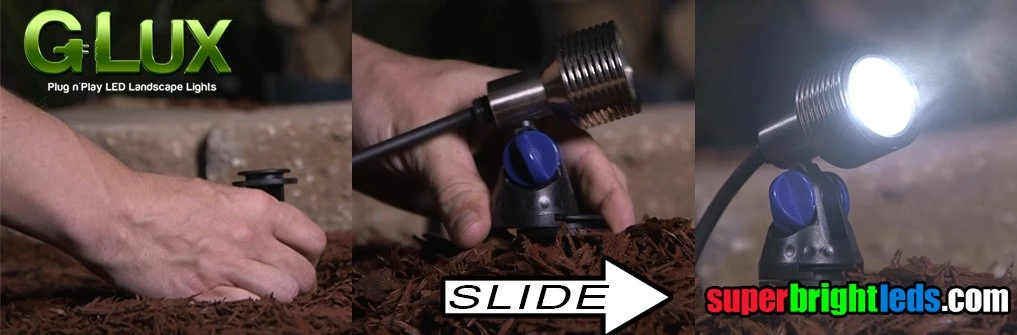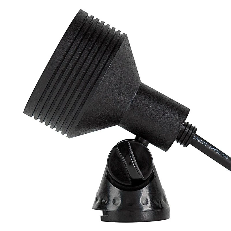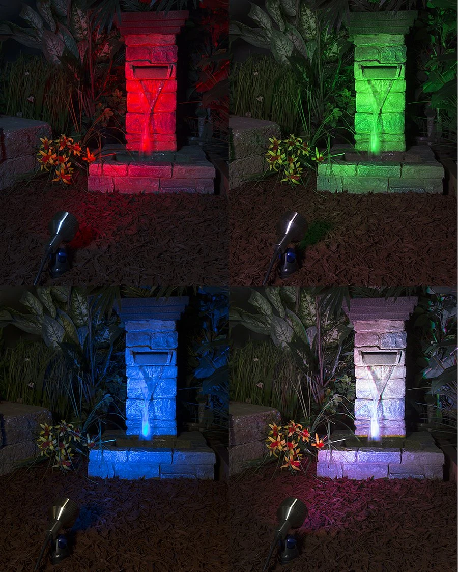 RGB LED landscape lights are an energy-efficient solution for architectural lighting, garden lighting, outdoor accent lighting, tree uplighting, and sign lighting. They’re also perfect for underwater pond lights and fountain lights when used with an optional weighted base. This 6-watt color-changing LED spotlight emits up to 200 lumens and produces a 40-degree beam pattern. An IP68-rated waterproof, textured black powder-coated brass housing protects internal components. An adjustable mounting base allows the fixture to be aimed up or down within 80 degrees of the mounting surface. The LED spotlight has 12V AC/DC operation and a 4-1/2′ power cord with a G-LUX plug-and-play connector for easy installation in a G-LUX landscape wiring system. It can also be used in a low-voltage landscape wiring system with a G-LUX pigtail power cable. It must be controlled with the G-LUX RGB Remote.