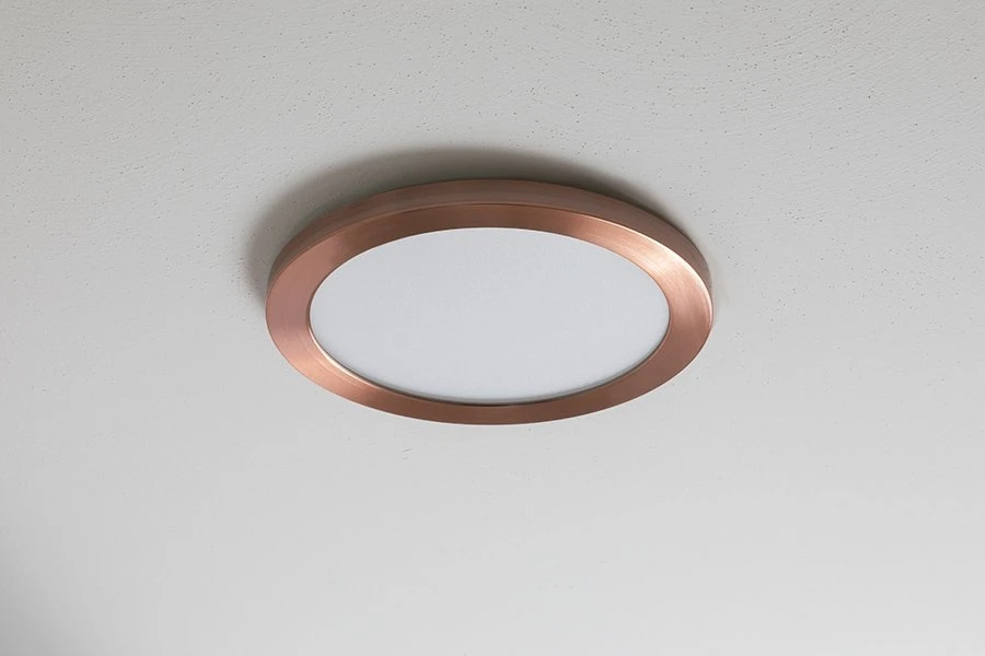 This slim 9″ LED downlight emits 1,440 lumens of dimmable natural or warm white illumination. It uses Even-Glow® technology, which consists of a light-guide plate and an optical diffuser, to deliver smooth illumination without visible bulbs or hot spots. Install the flush-mount ceiling light directly on a round or octagonal junction box with the light’s included bracket or in any existing 4″ or 5″-6″ can light housing with can light conversion kit hardware (sold separately). An E26/E27 Edison screw base adapter is included with the conversion kits. The 18-watt LED panel light is comparable to 100-watt incandescent bulbs but is designed to last 67 times longer. It has rose gold trim but is compatible with several magnetic trim finish options (sold separately). This LED light is perfect for living rooms, basements, offices, kitchens, and more.