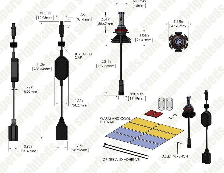 Increase your safety and visibility with this 9004 LED headlight/fog light kit. Each dual-beam LED headlight bulb comes with a glass sleeve and adhesive film options for changing the bulb’s color temperature. The bulbs emit 5,000 lumens of natural white illumination per set (2,500 each) but can emit yellow or cool white light by using the sleeve and one of the optional film choices. These bulbs feature 3rd generation cooling technology. They have compact heat sinks instead of short-lived fans or bulky braided heat sinks. This allows for a longer-lasting bulb that’s easier to install in tight spaces. The LED headlight bulbs last 13 times longer than halogen bulbs. LED arrays in each bulb are designed to mimic the filament in halogen bulbs—creating a closely matched beam style. These CAN Bus compatible bulbs operate on 9-32 VDC. The long-lasting kit includes 2 LED headlight bulbs, 2 9004 adapter plugs with drivers, 2 glass sleeves, 8 cool white and yellow film sleeve covers, and mounting accessories. Bulbs have been environmentally tested with film and sleeve installed. Film can be removed but not reused. Use glass cleaner on the included sleeve before applying another piece of film. Price per kit.