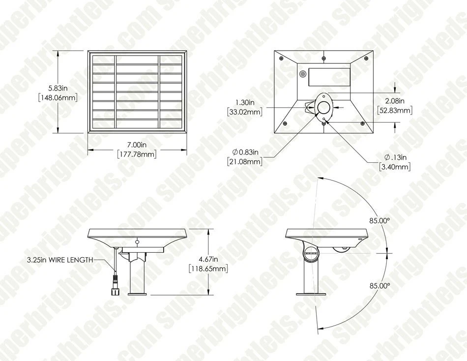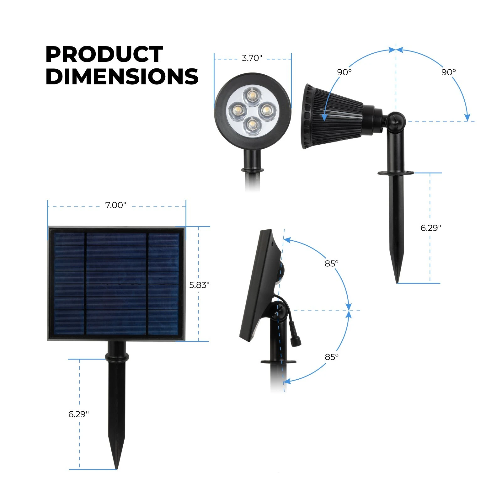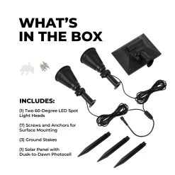 The dual solar spot light kit pairs a solar panel with two 60-degree LED spot light heads. Once fully charged, the dual-head spot light is ready for use. A switch turns the light on for automatic dusk-to-dawn operation and controls the outputs. Both heads have a high and low output, 45 lumens and 23 lumens, for a maximum of up to 90 lumens total. Full charge is reached in 4 to 6 hours with up to a 6-hour run time on high and 12 hours on low. The heads have 180-degree adjustable bases and ten-foot wire leads that connect to the photocell via a weatherproof connector. The panel is adjustable to 160 degrees. Use the included ground stakes for mounting or surface mount with included stainless steel screws. The dual-head solar spot light is IP45-rated weatherproof. Ideal for landscapes and architectural lighting.