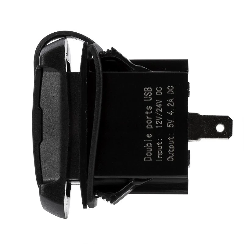 This Dual USB Charging Port Adapter lets you charge your cell phone, tablet, iPod, or other device and is designed to fit in rectangular switch panel openings. The port adapter has a built-in digital voltmeter to show vehicle battery voltage (8-24V display range) and ammeter to show amperage drawn from each USB device. The 12-24 VDC USB charger has a total output of 4.2 amps (2.1 amps from each port) at 5 volts. It has (2) 1/4″ male contact terminals to be used with 1/4″ female push-on connectors. The sealed, watertight USB rocker switch adapter easily installs in industry standard panel cutouts with the included rubber gasket. Modular switch brackets are available for single-switch mounting in a 0.83″ x 1.45″ hole.