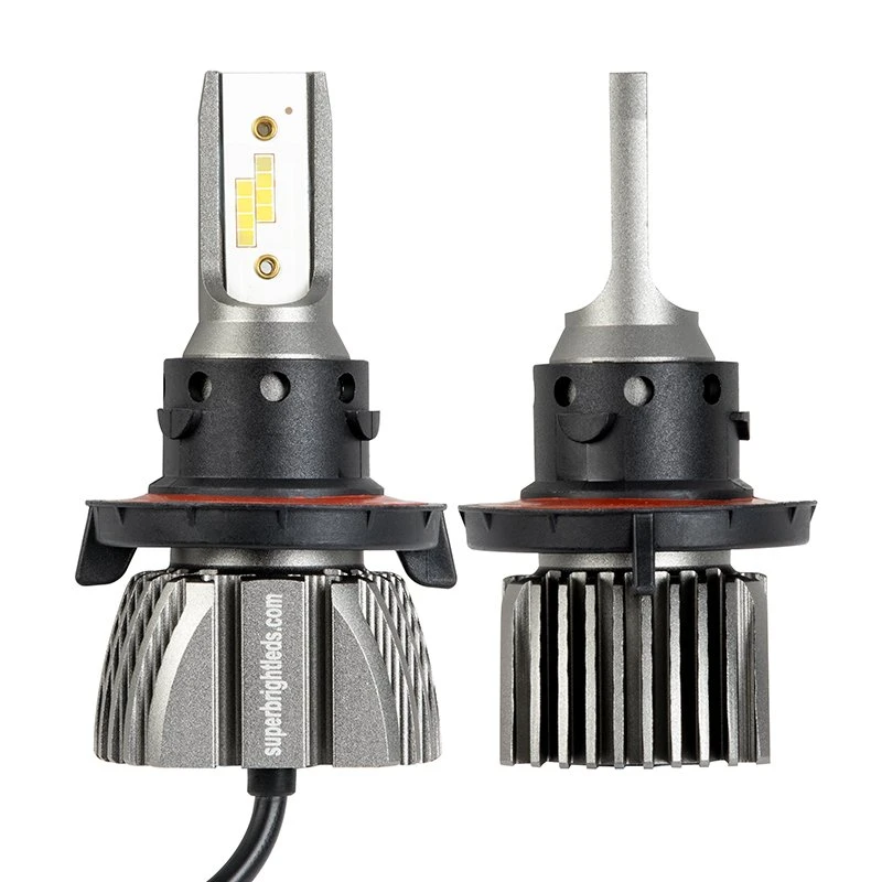 The H13 LED Headlight Conversion Kit is designed to upgrade or replace factory H13 or 9008 halogen combination headlight bulbs. The LED bulbs feature an integrated driver and a compact fanless design for easy installation. Integrated heatsinks in the aluminum housing provide thermal management. At 2,200 lumens per bulb, the conversion kit delivers 4,400 lumens of 6500K light, improving visibility and safety. Please check the bulb base and size to verify compatibility before purchasing.