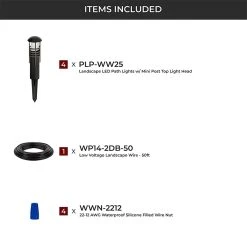 With this kit, extend the reach of existing landscape lighting. This set includes all necessary components to add to path illumination, complete with 4 Path Lights, 50′ of low-voltage landscape wire, and 4 waterproof wire nuts. The path lights each have the look of a traditional post-top light, in miniature scale on a 20″ aluminum post, adding quality illumination as well as architectural flare. They’re finished in a bronze powder coating, and running on only 2-watts of power. Included wire and wire nuts allow for quick convenient connections that resist the elements.