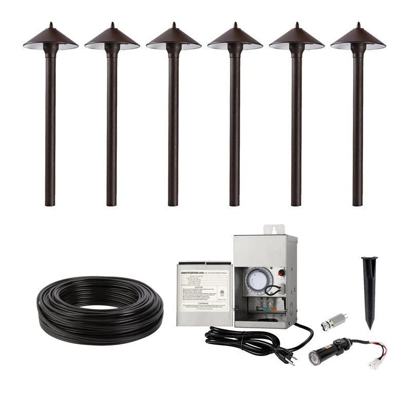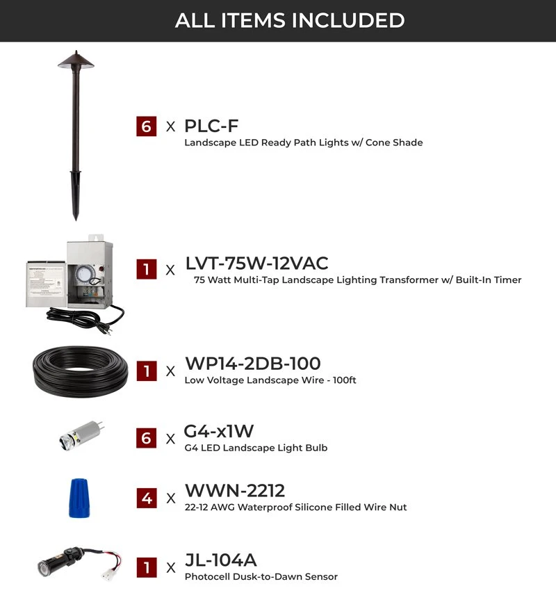 With cone shade path lights, stainless steel transformer, and powering accessories, this kit has all the necessary components for quality landscape illumination. All path lights take included G4 bulb, have powder coated aluminum, and come with a 6″ metal spike to endure harsh elements wherever it’s installed. 75W stainless steel transformer is low voltage and compatible with the included photocell sensor. Black wire and twist-on wire connectors complete the weather proof set.