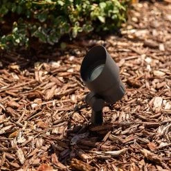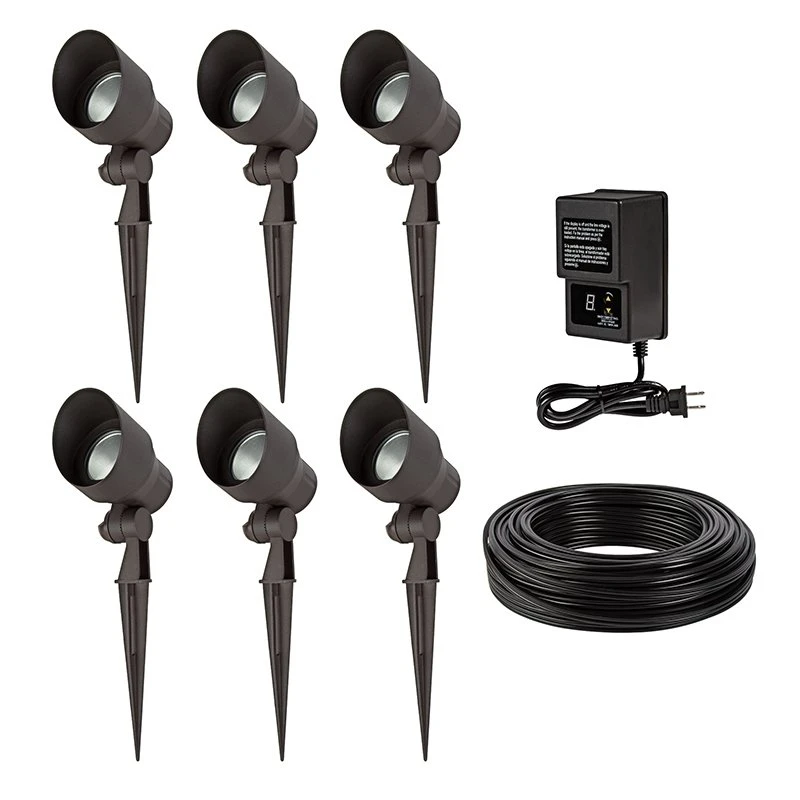 With adjustable head spotlights, low voltage transformer, and powering accessories, this kit has all the necessary components for quality landscape illumination. All spotlights have integrated LEDs, powder coated aluminum, and a 6″ metal spike to endure harsh elements wherever it’s installed. Low voltage transformer has digital controls that can select between three operational modes: constant ON, dusk to dawn, or timed OFF 1-9 hours after dusk. Black wire and wire nuts complete the weather proof set.