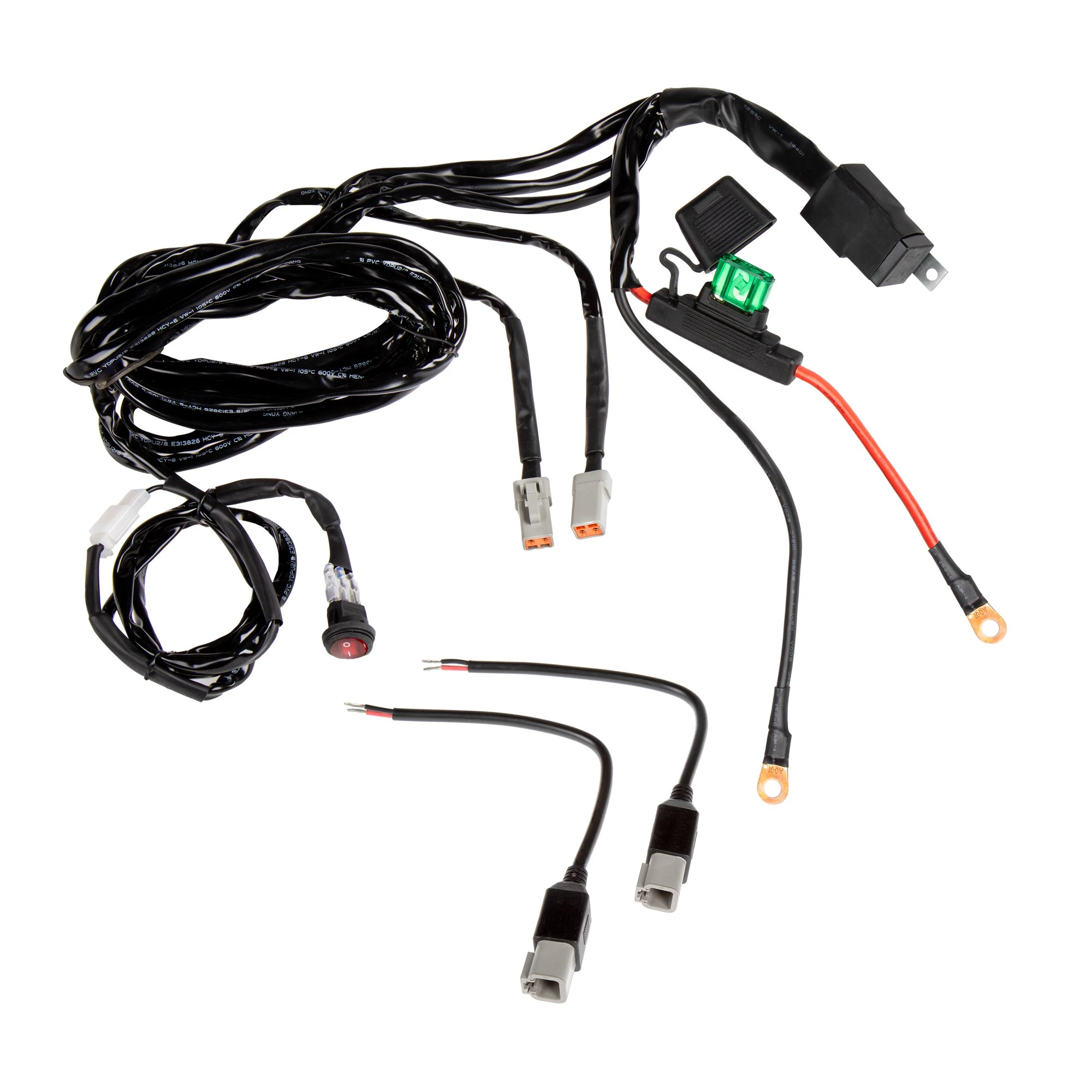 The dual output LED light wiring harness with switch and relay is a complete plug-and-play wire harness for LED work lights and off-road light bars with DTP connectors. The kit includes an On/Off switch with LED indicator light, fuse, automotive relay with solderless spade connections, and DTP pigtail adapters. Kits have a maximum load of 20 Amps (10 Amps per channel). Ideal for installing lights on various vehicles, including but not limited to ATVs, off-road vehicles, and snow plows. Wiring harness is for 12V products only.