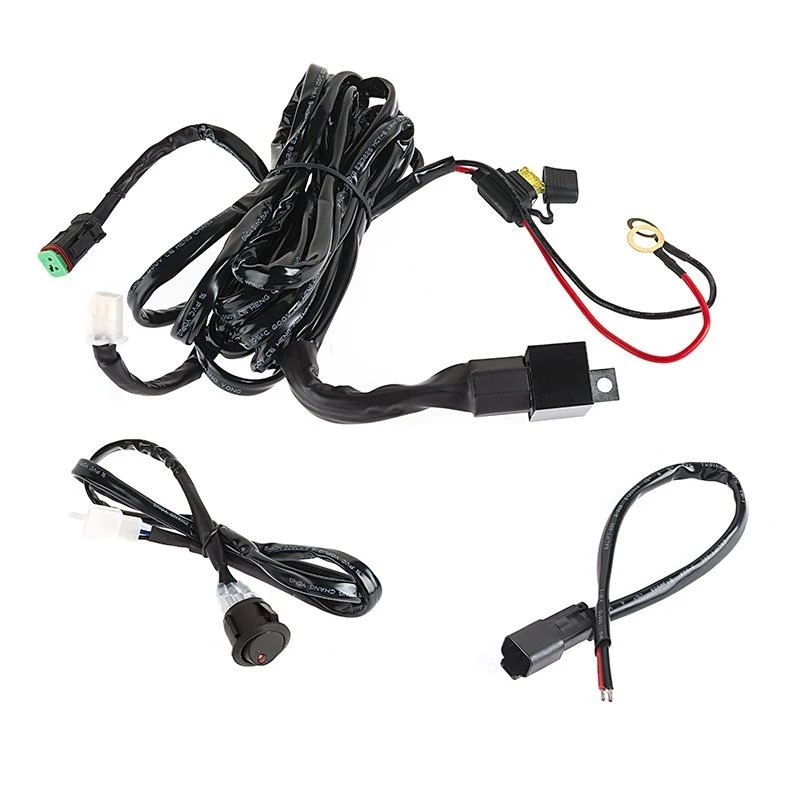 The single-output LED light wiring harness with switch and relay is a plug-and-play harness for LED work lights and off-road light bars. Each harness includes an On/Off switch with an LED indicator, fuse, and automotive relay with solderless spade connections. It has a 115-inch length with a 6-inch DT pigtail adapter. The maximum load is 18 Amps. Wiring harness for 12V products only.