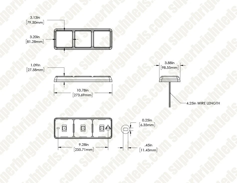 These LED Stop/Turn/Tail/Reverse truck and trailer rear combination lamps meet DOT FMVSS 108 and SAE requirements for use as tail lights, brake lights, parking lights, turn signals, and reverse lights. Rearrange the assembled red, white, and amber light heads in any configuration in the black polycarbonate housing. Mount the housing vertically or horizontally on either side of box trucks, tow trucks, dump trucks, ton trucks, trailers, and flatbed trucks. These energy-efficient LED lamps operate in a broad 12-80 VDC range. The sealed light heads have an IP67 waterproof rating. Lights include mounting hardware.