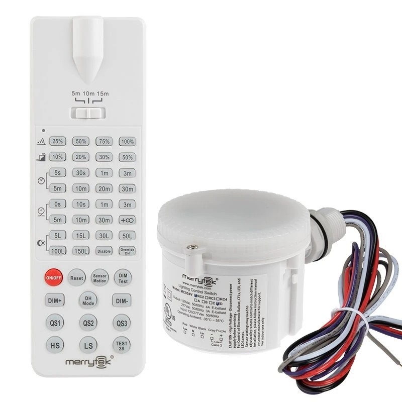 Merrytek Microwave Occupancy Sensor provides hands-free and efficient operation of light fixtures. Highly configurable, the motion sensor includes customizable control options including detection range, daylight threshold, dimming level, and standby period. Mount to any 1-10V dimmable fixture in a standard ½” knockout. The remote can be used to access control features, as well as be paired with multiple sensors to control several light fixtures.