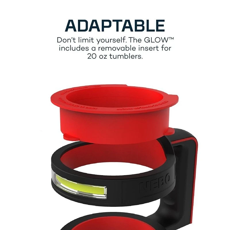 The NEBO GLOW LED Light and Handle not only makes your 30 oz. or 20 oz. tumbler easier to hold and carry, but also gives you the power of light with out moving a finger. No more slipping, dripping or tripping in the dark while trying to balance your tumbler when your hands are full. The GLOW fits most standard vehicle cup holders, and perfectly holds your tumbler secure with the rubberized grip ring.