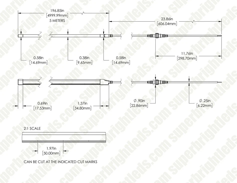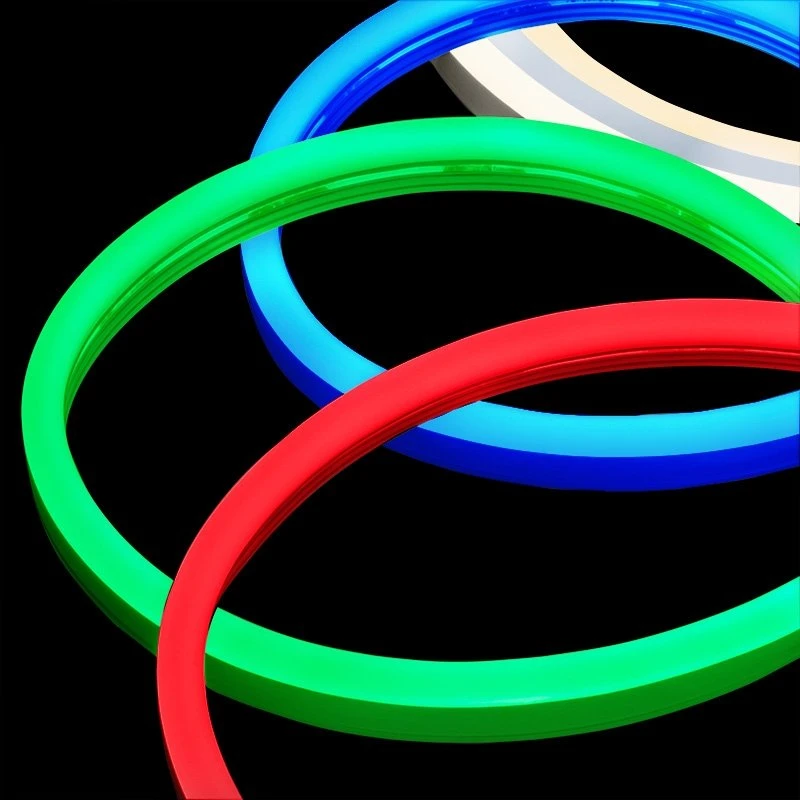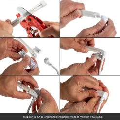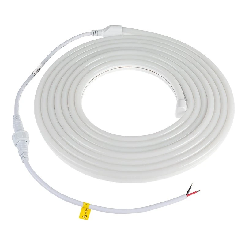 Add the striking look of neon with these durable, flexible neon LED strip lights providing accent lighting with added safety and efficiency over traditional neon glass tubes. These side bend strips offer a continuous line of light in single-color (red, green, blue) or white (warm, natural, cool) light. With a shatterproof, IP65-rated watertight construction, these strips are ideal for use outdoors and in damp locations. Each strip can be cut at 1.97in (50mm) for length customization. Each strip includes a straight power cable with a screw connector and a pigtail connector to wire a 24VDC power supply. The max run is one 16.4ft (5m) strip for white or two strips, 32.8ft (10m) for red, green, and blue. Wire back to the power supply for longer runs. Top-bend neon strip lighting is also available.