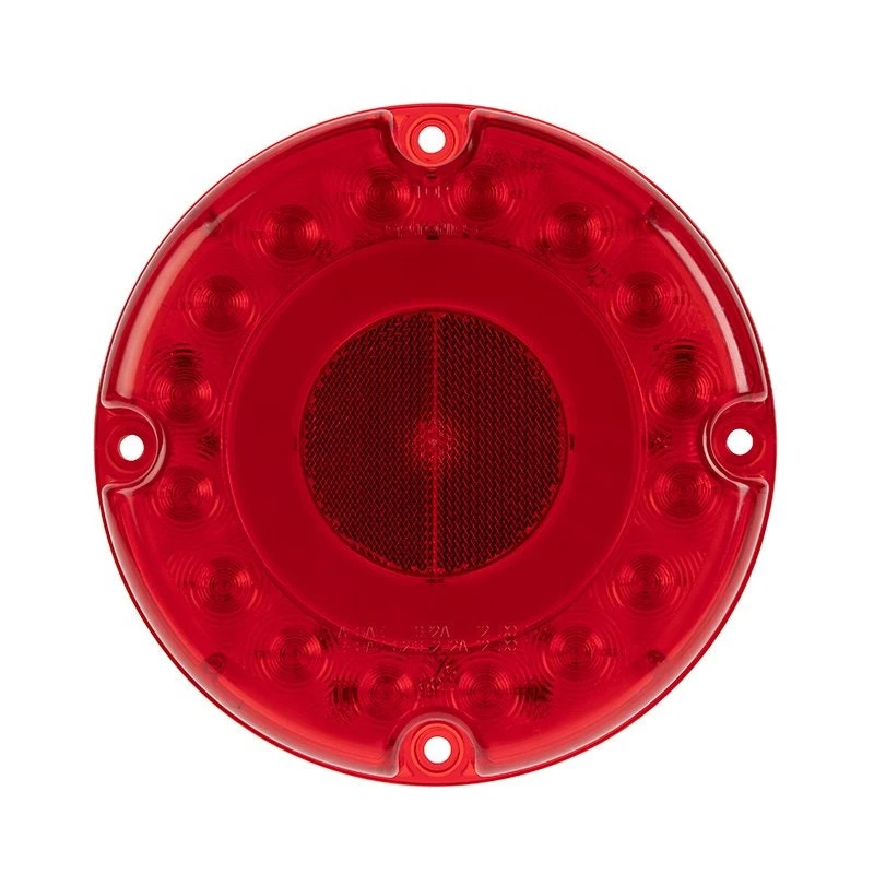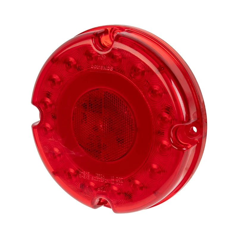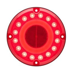 The 7″ round GloLight LED transit tail light by Optronics is ideal for stop light, turn signal, and tail light applications and features a built-in reflex reflector. The light is constructed with durable polycarbonate and has an IP67 waterproof rating. Hardwire this 32 LED light with the included ground wire. Use the included gasket to protect your finish for safe surface mounting. P2 rated.