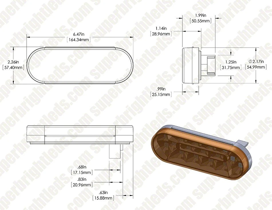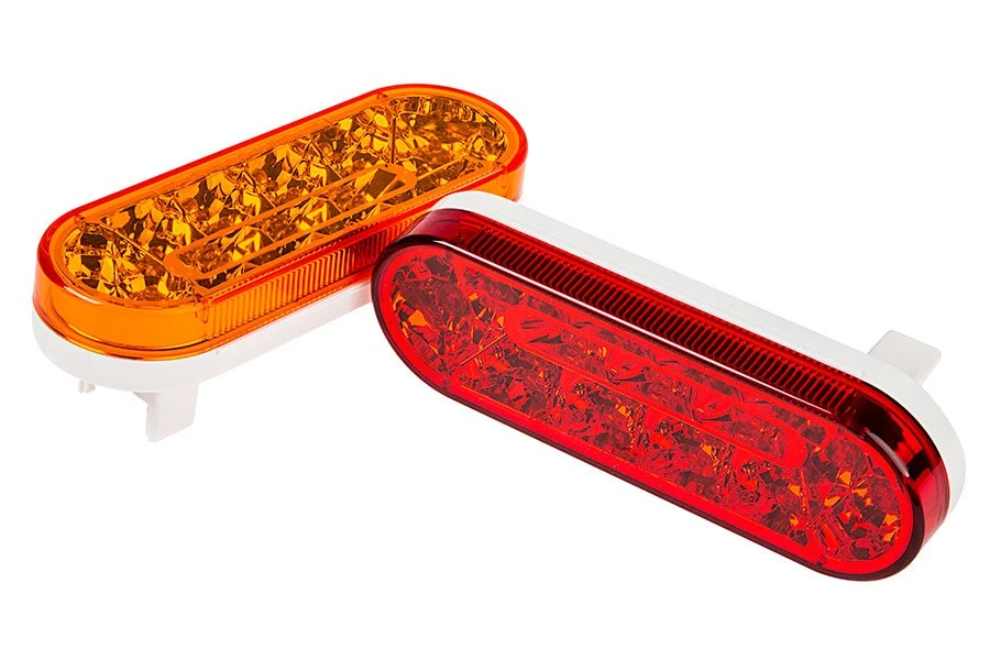Designed to accept industry-standard 3-pin plugs, this 6” oval LED light meets DOT FMVSS 108 requirements for use as brake lights, turn signal lights, hazard lights, parking lights, and tail lights. Mounts flush with a compatible grommet, bezel, or flange. Each light boasts 17 high-flux LEDs that operate within a wide 9-14.8V DC range and consumes 90% less energy than incandescent lamps. Sonically sealed polycarbonate lens and weatherproof housing. The truck/trailer lights are available in amber or red. Lifetime warranty on all truck/trailer lights. See the similar clear lens version.