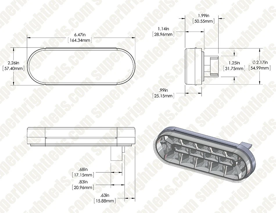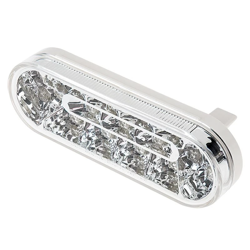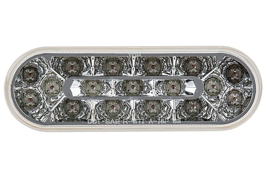 This 6″ oval 17 LED light with a clear lens meets DOT FMVSS 108 requirements for use as brake lights, turn signal lights, hazard lights, parking lights, or tail lights. A sonically sealed polycarbonate lens and weatherproof housing protect the light from harsh outdoor conditions. The light accepts industry standard 3-pin plugs and flush mounts easily with a separate grommet, mounting bracket, and 3-pin connector to provide stop, turn, or tail lights on vehicles (see accessories). See a similar colored-lens version.