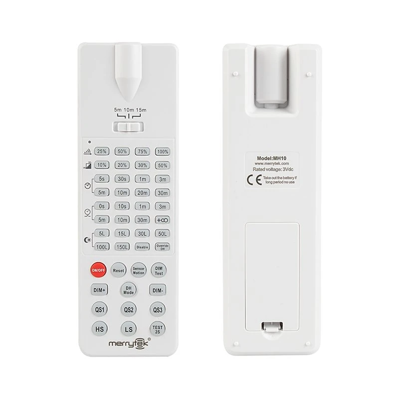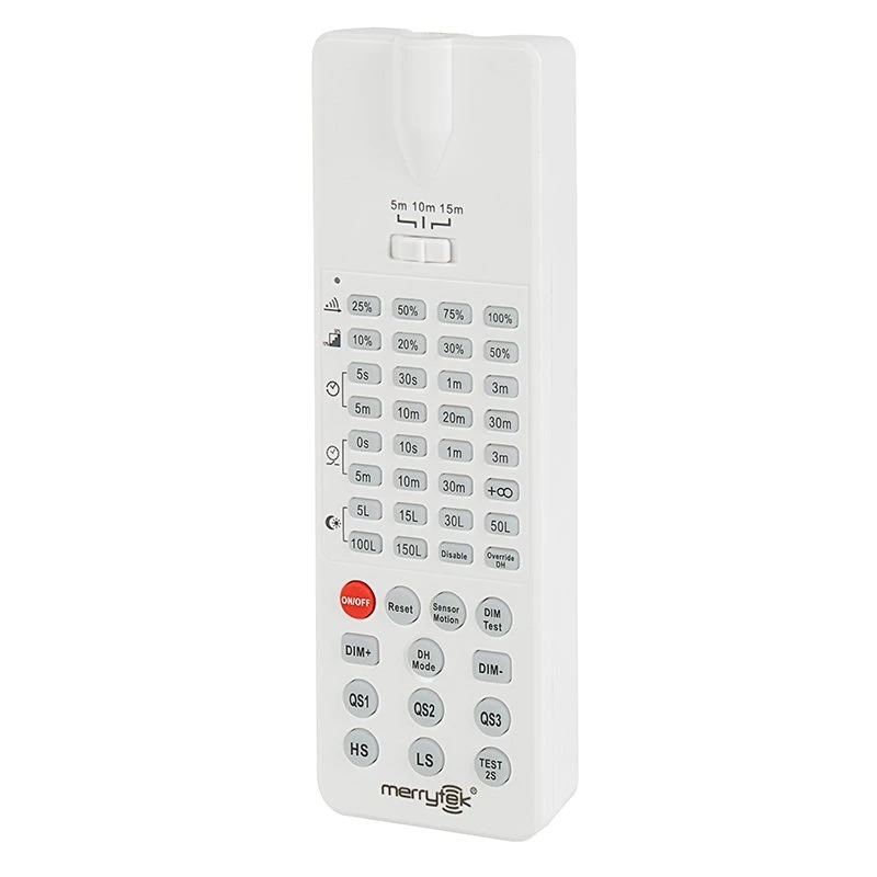 Use this handheld remote to customize settings on your Merrytek Motion Sensor. The remote allows you to control detection range, daylight threshold, timer, and dimming settings.