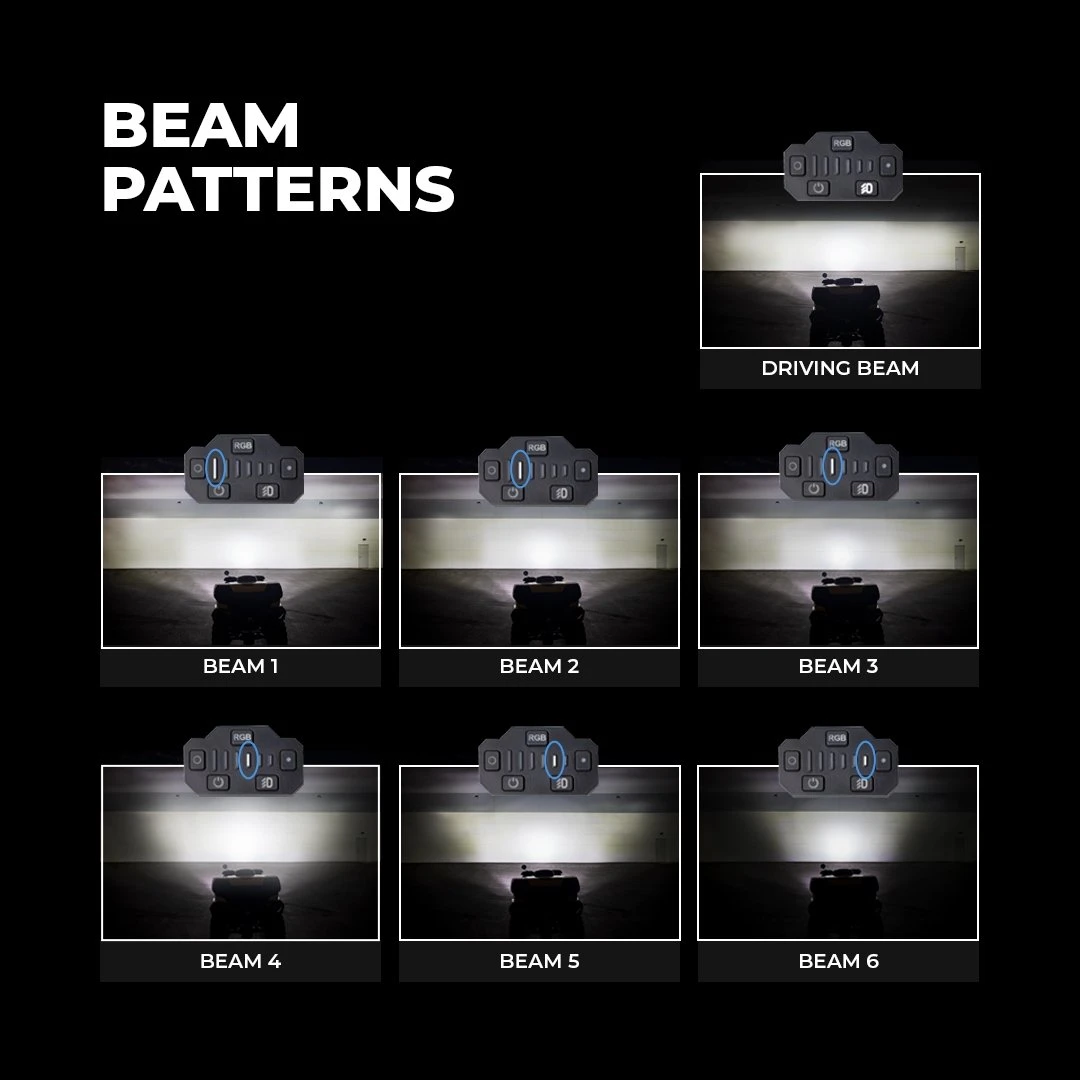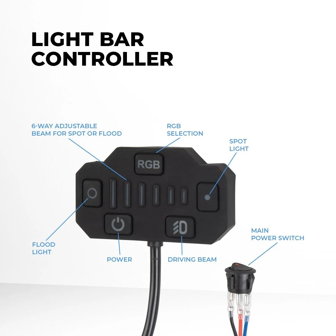 - Integrated controller cycles through 7 RGB colors, 6 adjustable beam angles, driving beam on/off, power on/off
