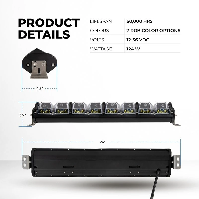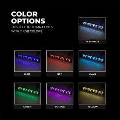 20″ LED Off-Road Light Bar features RGB Backlighting, 6 adjustable beam patterns, and dedicated 30° driving beam. Adjustable beam patterns range from 10° spot to 60° flood, as well as a 30° driving beam—ideal for slow, moderate, and high off-road speeds. RGB backlight includes 7 color options (Red, Green, Blue, Yellow, Purple, Cyan, and RGB White). Complete package also includes stainless steel brackets and hardware, and a wiring harness with relay, in-line fuse, main power rocker switch, and hardwired controller backed with double-sided tape. Rugged aluminum housing and polycarbonate lens mean this light bar is built to last, backed by a Lifetime Warranty.