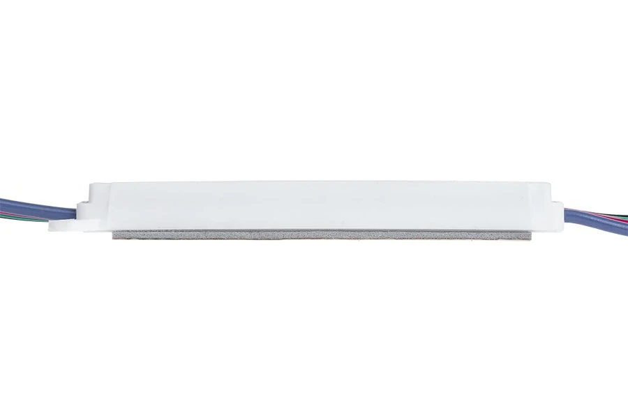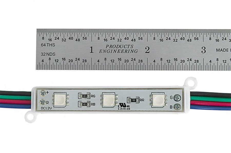 These RGB LED light modules provide consistent illumination for channel letters, sign lighting, under-cabinet lighting, store window lighting, display case lighting, and trade show lighting. Modules are available in 25 packs or 100, stranded together upon purchase. Strands are wired together with 3.20″ spacing between each module (up to 25 modules per strand). Each LED module has 3 LEDs and emits up to 22 lumens. LEDs emit a wide 120° beam pattern that is best suited for illuminating up to 9″ wide channel letters that are as shallow as 3″. The narrow PVC module is injection molded with (2) 0.11″ screw holes for mounting in extreme cold or heat. Double-sided 3M adhesive foam tape is also included for secure mounting. The waterproof module has 12V DC operation and is designed to last 40,000 hours. Choose a compatible RGB controller for color control options.
