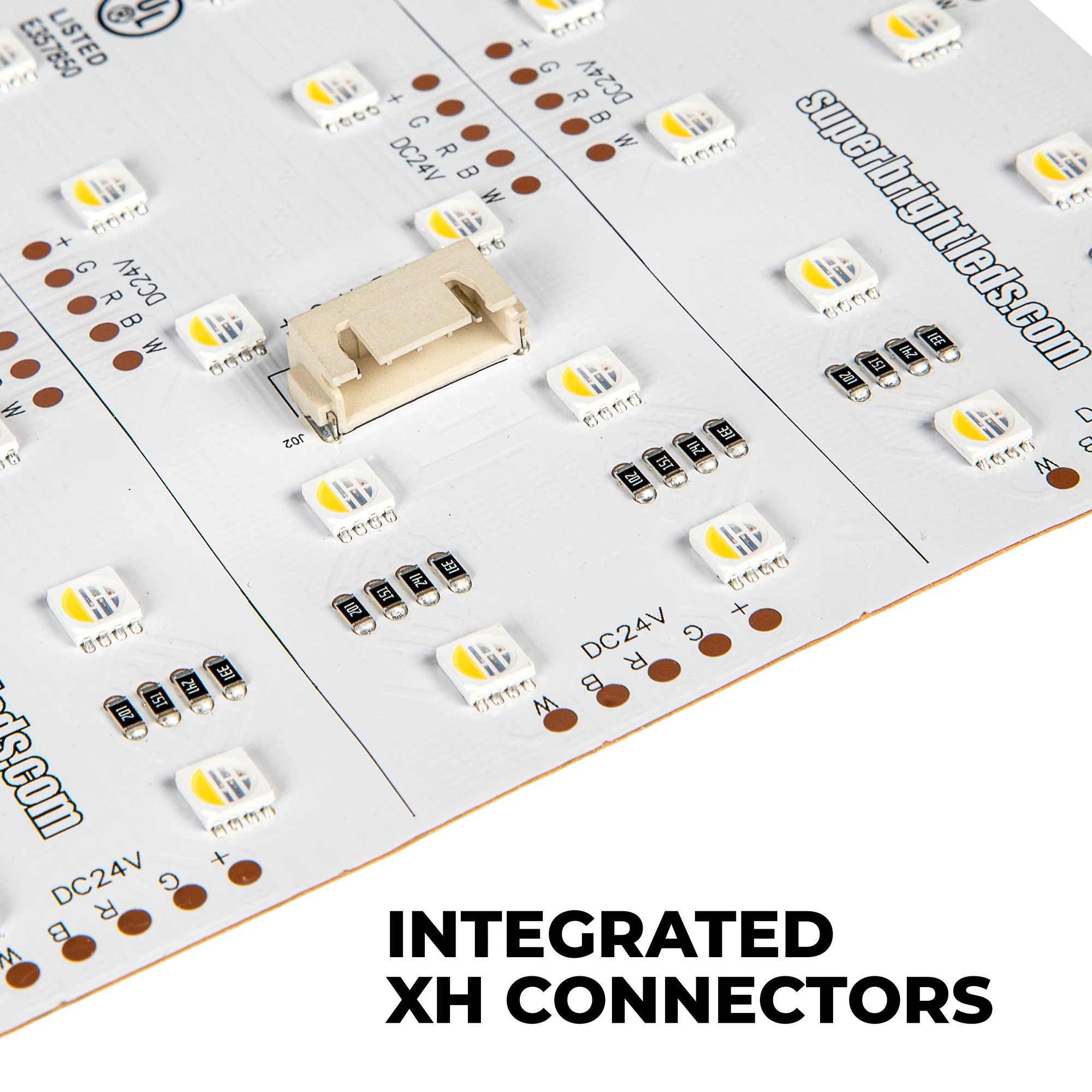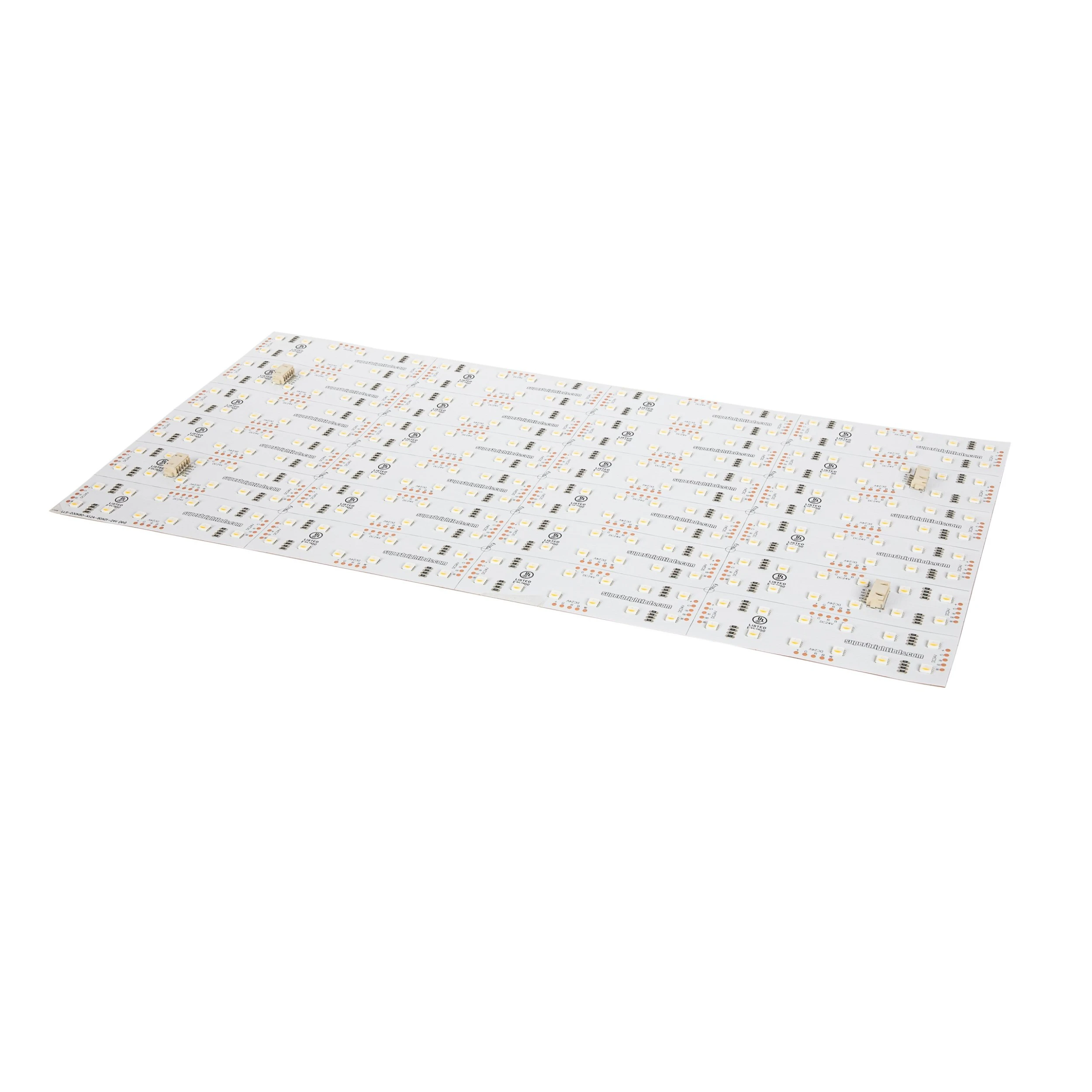 The RGB+W LED light sheet is fully customizable, color-changing, and adaptable for light boxes, logos, billboards, and more. The segments have cut lines along the board to shape the light sheet to the application, ideal for signs or backlighting. On-board XH connectors eliminate soldering and simplify installation. To connect multiple light sheets, use the included interconnect cable. To install, use the 3Mβ’ adhesive backing, or fasten it with screws at the indicated spots.