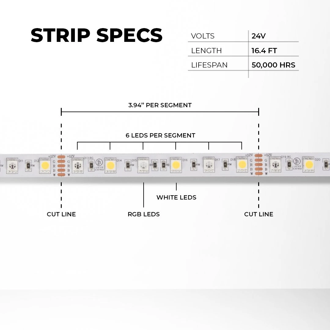 - (5m) RGB+W LED Strip Light – 24V – 204 lm/ft