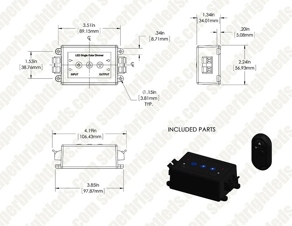 This LED dimmer with wireless RF remote is perfect for operating your single-color LED light strips. The LED dimmer and remote have brightness arrow buttons to dim light strips from 0%-100% using Pulse Width Modulation (PWM). Power-cycle mode retention allows your light strip to return to the mode that was selected before it was powered off. The dimmer has a maximum load capacity of 8 amps and is compatible with LED light strips that operate with in a 12-24V DC range. Spring terminal connectors on the dimmer allow for power in and out connections and are polarity sensitive (red is positive, and black is negative). Includes remote battery.