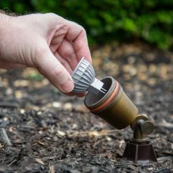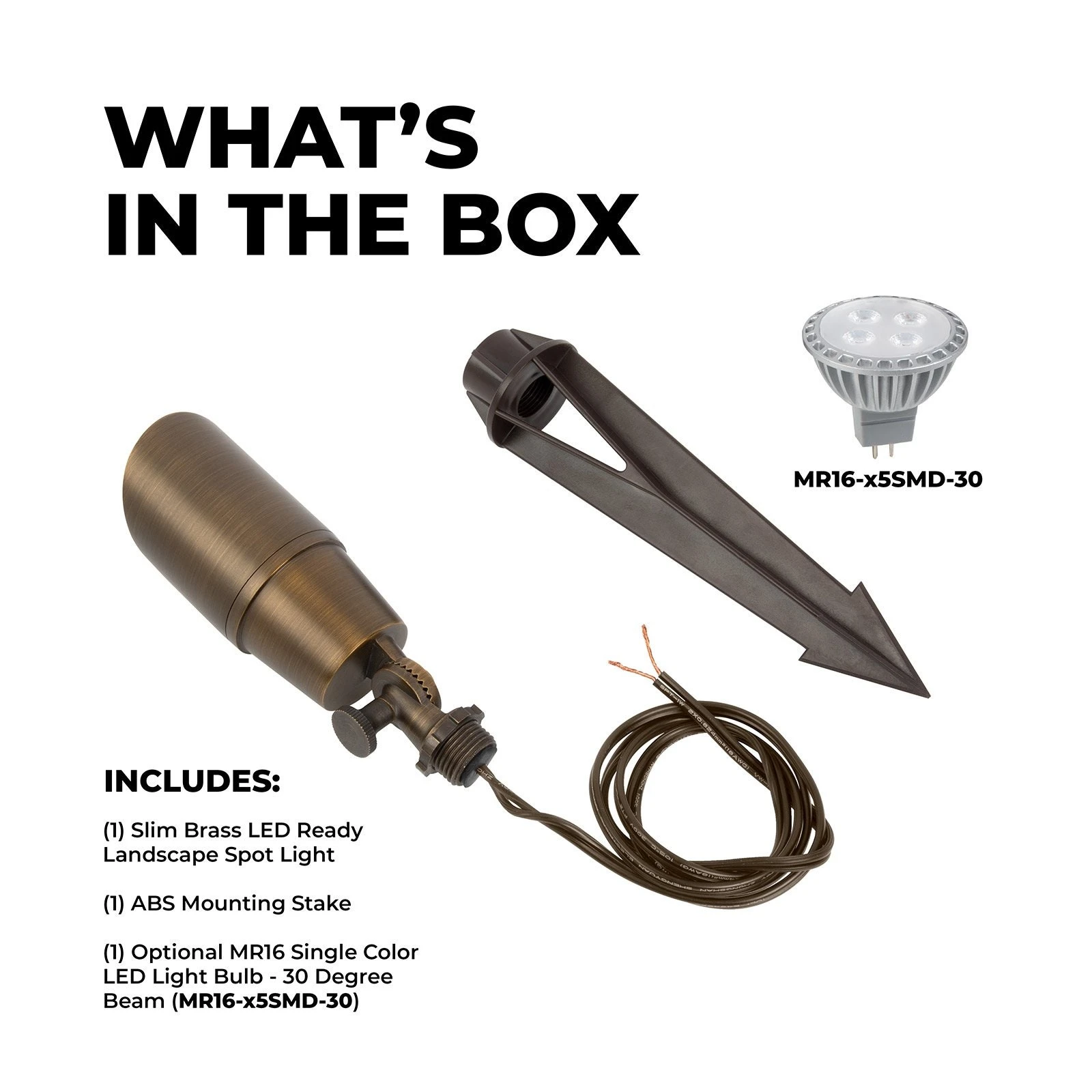 The solid brass LED-ready landscape spot light is available with an MR16 bulb in warm, natural, or cool white. The adjustable glare shield houses the round glass lens and fits the lamp housing with an o-ring-sealed waterproof design. A 180-degree adjustable knuckle mount lets you aim the beam for focused lighting. This brass landscape spot light is ideal for tree uplighting, subdivision signs, and architectural lighting.