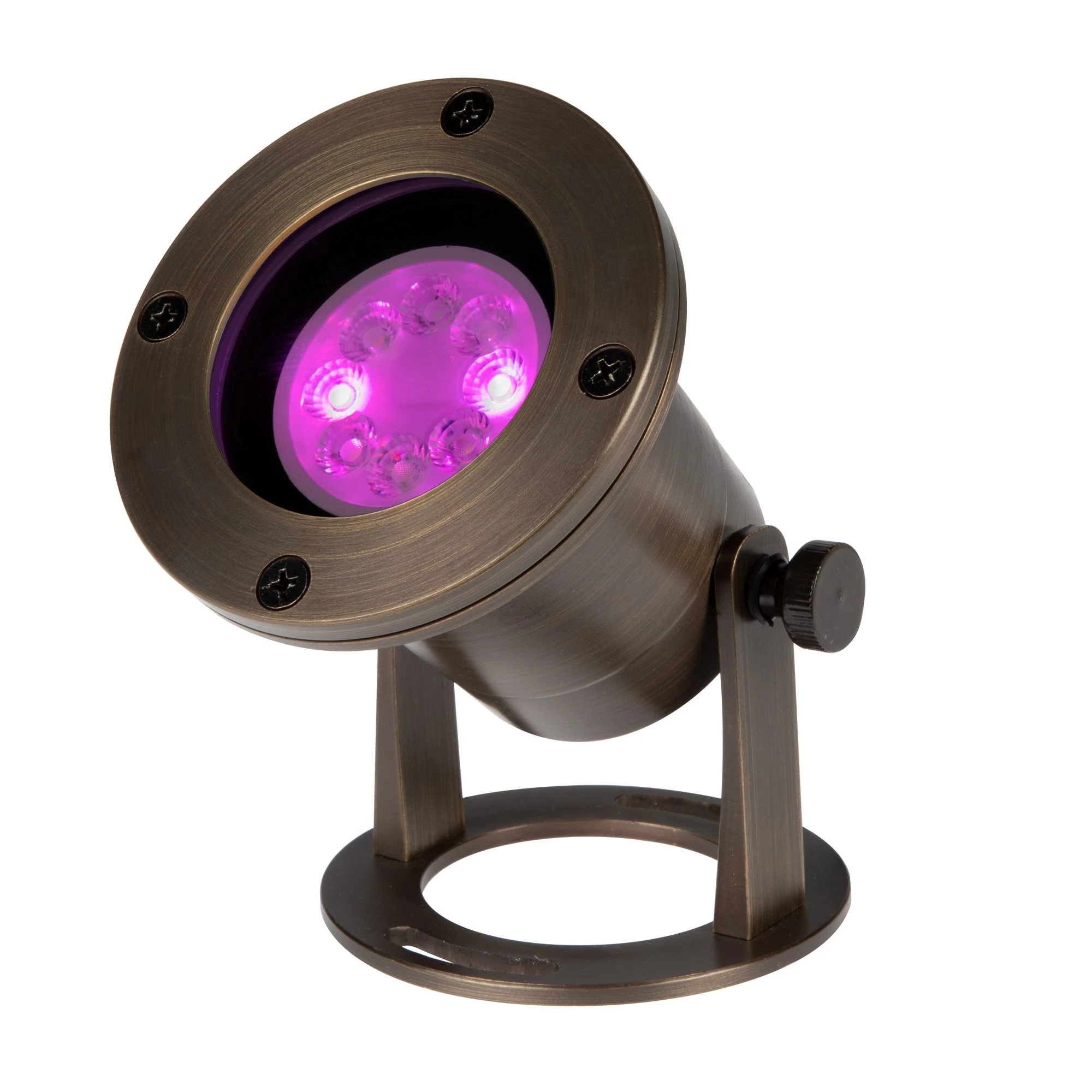 The solid brass LED-ready landscape underwater light is available with an RGB+tunable white smart bulb and optional MiBoxer RF remote control or MiBoxer Wi-Fi controller. Pair the bulb with your smartphone, tablet, Amazon Alexa, or Google home assistant for hands-free control with the Wi-Fi hub. The bulb can be customized, selecting from various color-changing/white modes and adjusting the speed, brightness, color, saturation, or white color temperature. The faceplate houses the round tempered glass lens with a silicone seal and a sealed wire exit making the construction waterproof. An adjustable mounting base allows for precise positioning to aim the beam. This solid brass underwater light is ideal for landscapes with ponds, fountains, waterfalls, and other water features.