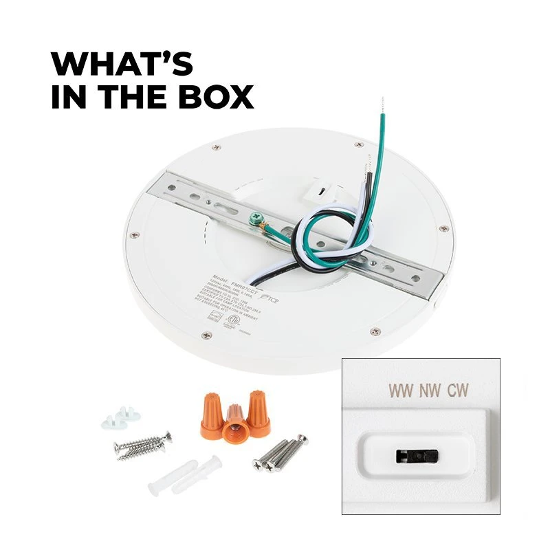 TCP’s 7″ LED Slim Flush Mount Fixtures are perfect for new construction or retrofit projects. They are color selectable and are available with multiple color trim options for a custom design. The field-selectable CCT allows you to select the color temperature that best suits your needs. The frosted lens diffuses the 120° beam angle, producing a uniform light distribution. Install directly to a junction box or within a 5″ or 6″ recessed can. IC Rated for contact with insulation.