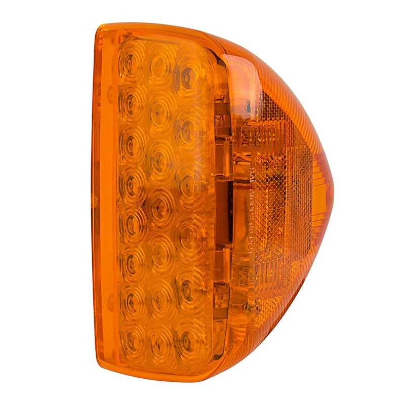 This Triangle LED Turn Signal Light is DOT compliant and meets SAE requirements for use as a front turn signal light, clearance light, parking light, side marker light, and reflex reflector on 1987-2007 Peterbilt 379 trucks with triangle turn signals. The amber light fixture boasts 31 LEDs (21 on the front, 4 on the side, and 6 on the back) and consumes 90% less energy than incandescent lamps. This LED light features a foam anti-scratch pad and 1′ power wires with bullet connectors for simple surface mounting and installation. A weatherproof, shatter-resistant polycarbonate lens is built to with stand impact with road debris and exposure to wet conditions. The LED truck light operates with in a 10-14.5 VDC range. Lifetime warranty on all truck/trailer lights. Price per fixture.