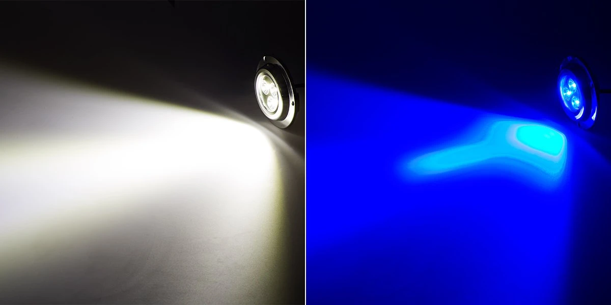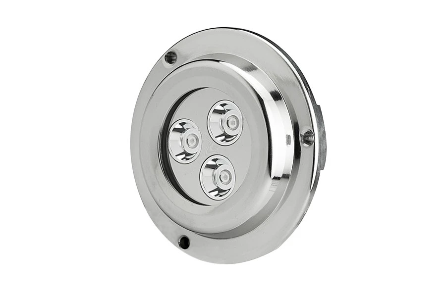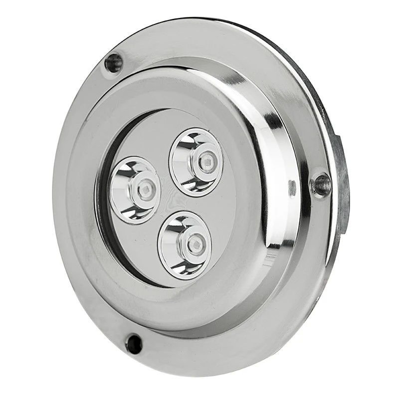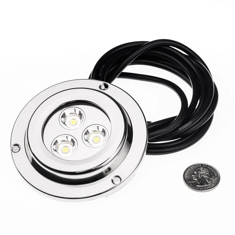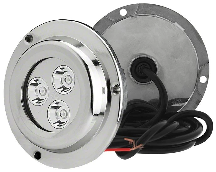 These underwater LED lights function as transom lights, pool lights, pond lights, fountain lights, and are also great for underwater dock lighting. The vibration- and shock-resistant LED light has a 316 marine-grade stainless steel housing with a shatterproof polycarbonate lens. Using only 3 LEDs, this underwater light emits up to 550 lumens of cool white. The 9-watt waterproof LED light has a built-in constant-current driver, 12V DC operation, and is designed to last 50,000 hours.