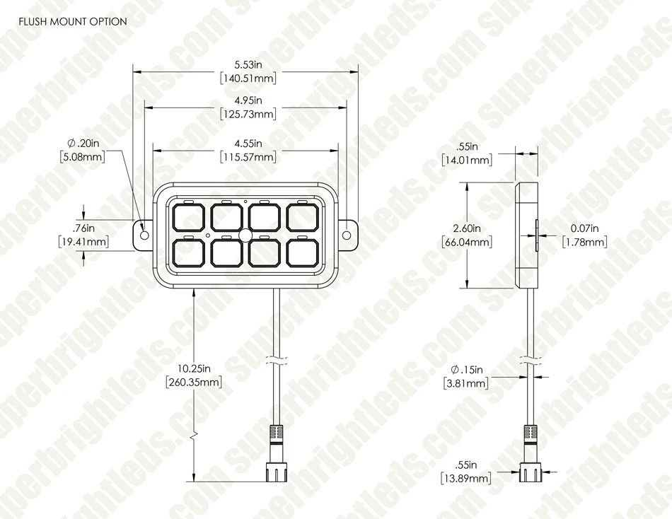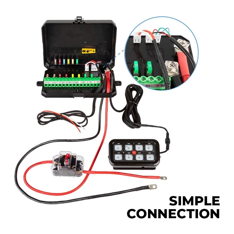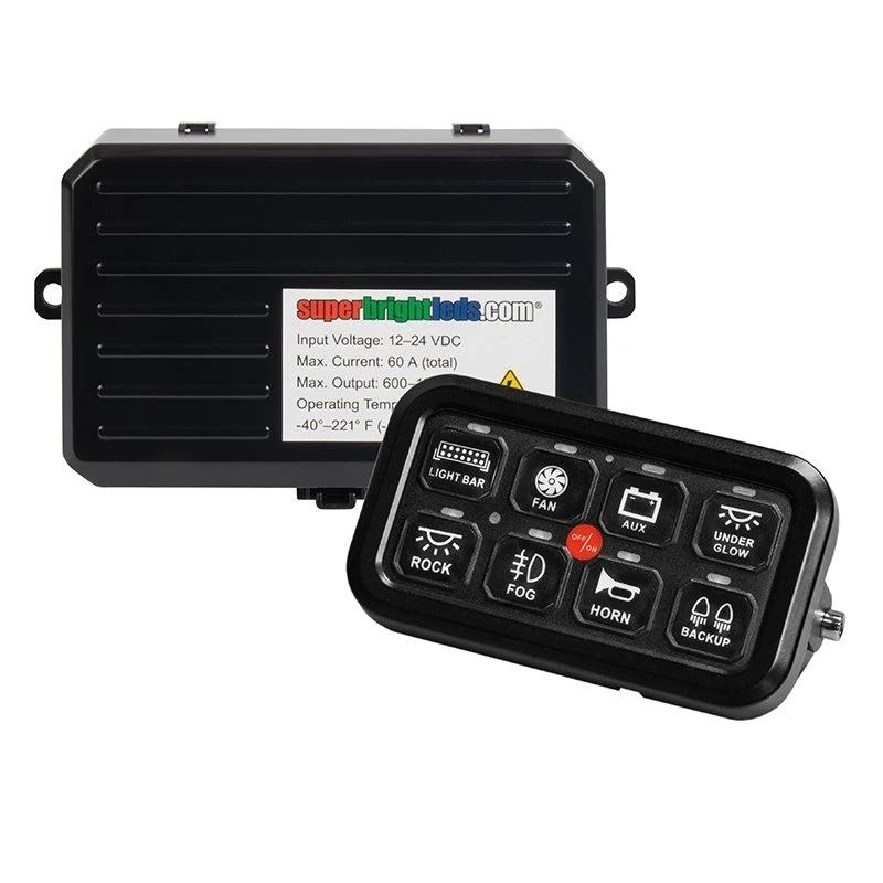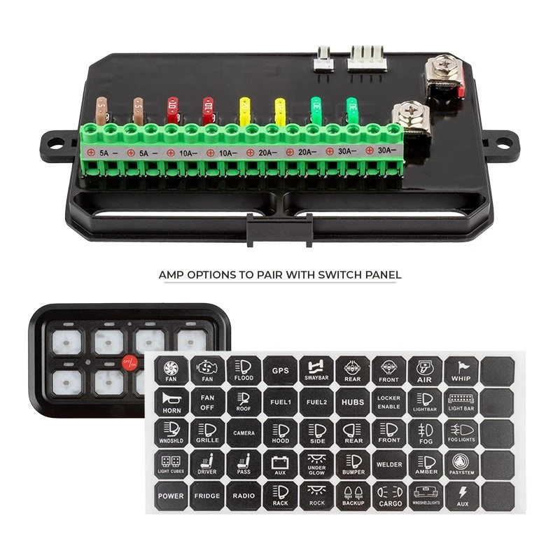 Control up to 8 individual LED lights or electrical devices using the 8 channel LED switch panel. Each channel has 3 modes- on/off, momentary, and strobe- that can be individually programmed. Mount the separate power distribution block under the hood to eliminate bulky wiring. Circuit breaker is included for safety; max current on one channel is 30 amps and the max current for the system is 60 amps. Switch panel can be labeled with included stickers. Ideal for off-road vehicle lighting, utility vehicle lighting, and boat and marine lighting.