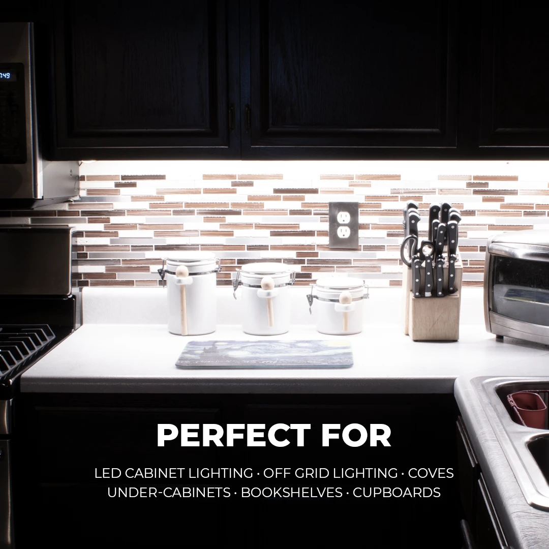 Our in-house lighting specialists developed this LED strip kit with you in mind. Each kit includes everything you need for simple, stress-free installation and use. Use solderless clamps to quickly and safely connect segments of LED strip tape with out the hassle of wire stripping or splicing. Long-lasting 3M™ adhesives ensure easy mounting to virtually any surface. Adjust brightness and switch between dynamic modes with the ultra-slim wireless RF remote. Perfect for a variety of kitchen lighting applications, including under-cabinet and interior cabinet illumination, above-cabinet ambiance lighting, and toe-kick accent lighting.