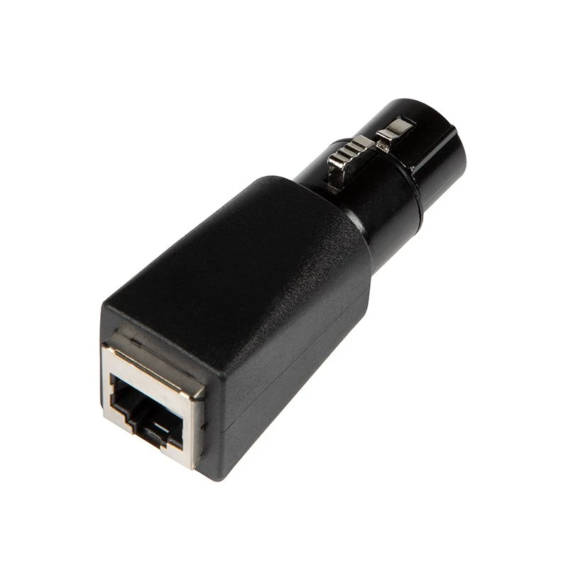 The DMX adapter connects a female 3-pin XLR output to a female RJ45 input, preventing lossless transmission of the signal. The cable is constructed of a shielded copper cable and zinc alloy connectors for secure connectivity with no interference.